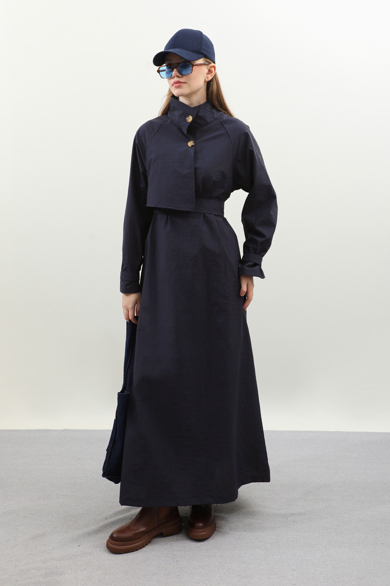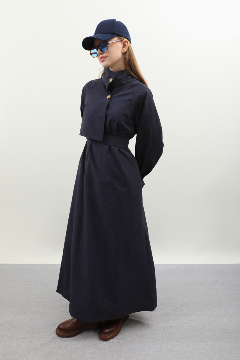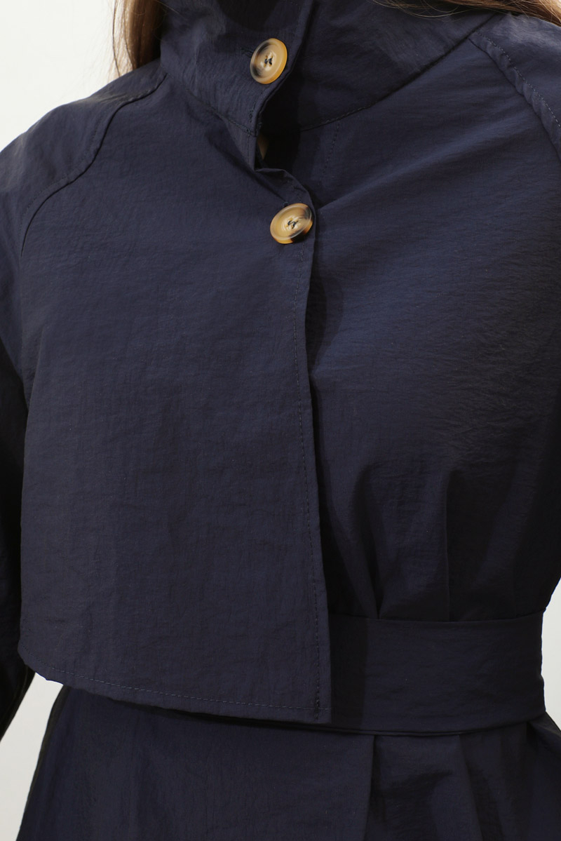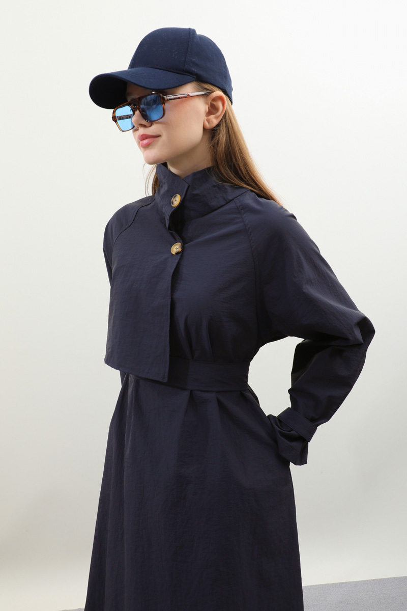 YYarım Rüzgarlıklı Paraşüt Elbise Lacivert. Balıkçı yakadır, önden düğmelidir, reglan kolludur, hareketli rüzgarlık detaylıdır, manşetleri ayarlanabilir kemerlidir, astarlıdır, yandan ceplidir, kuşaklıdır, Günlük kullanım ve özel günlerinizde tercih edebilirsiniz.