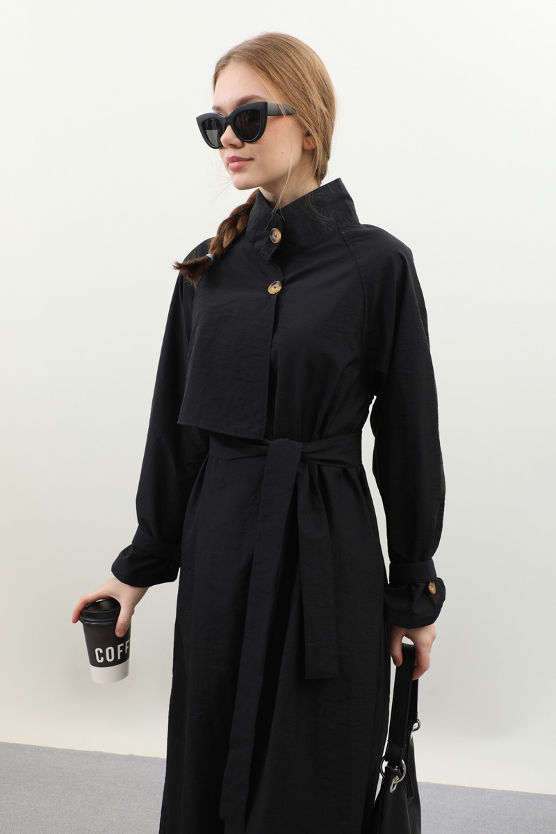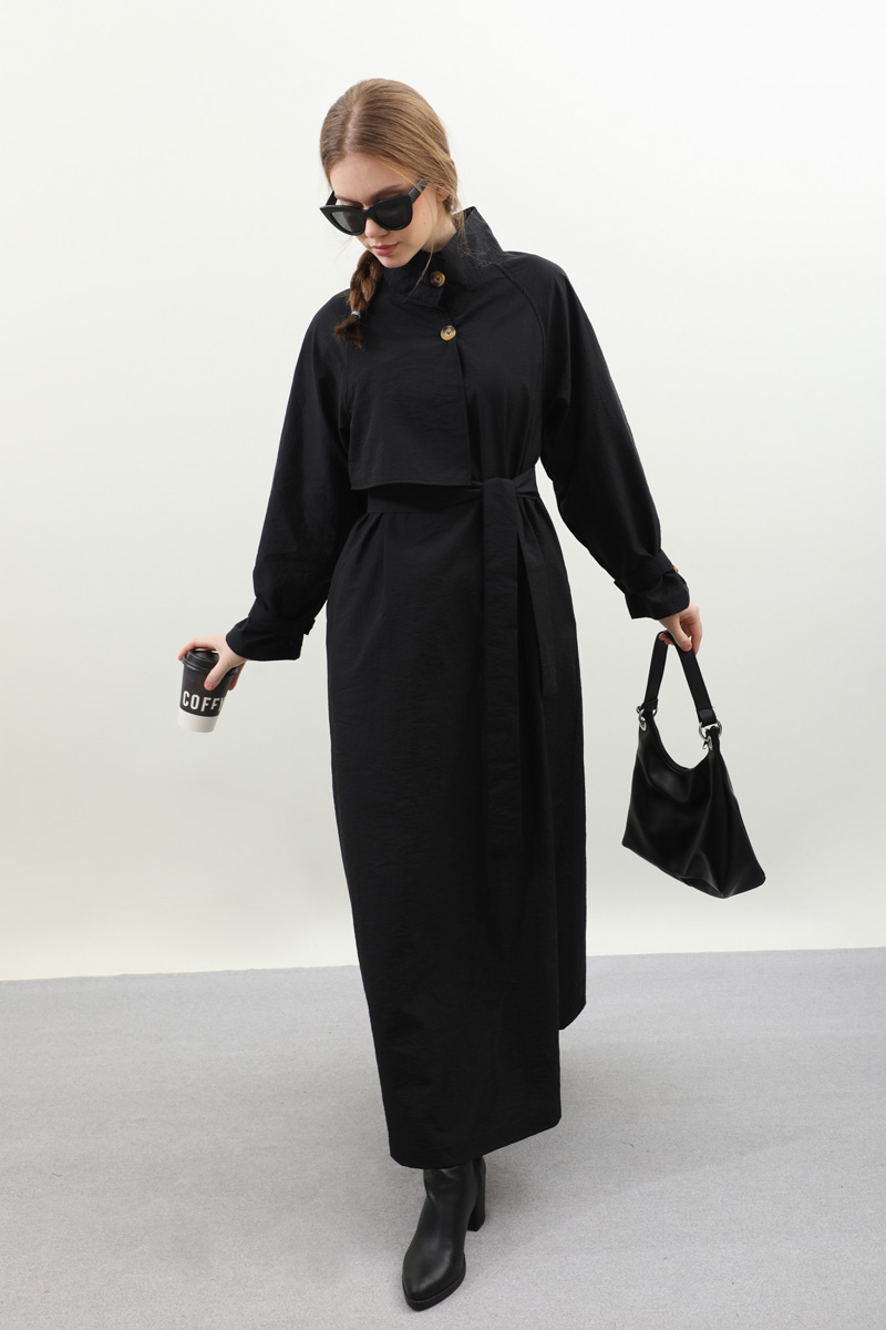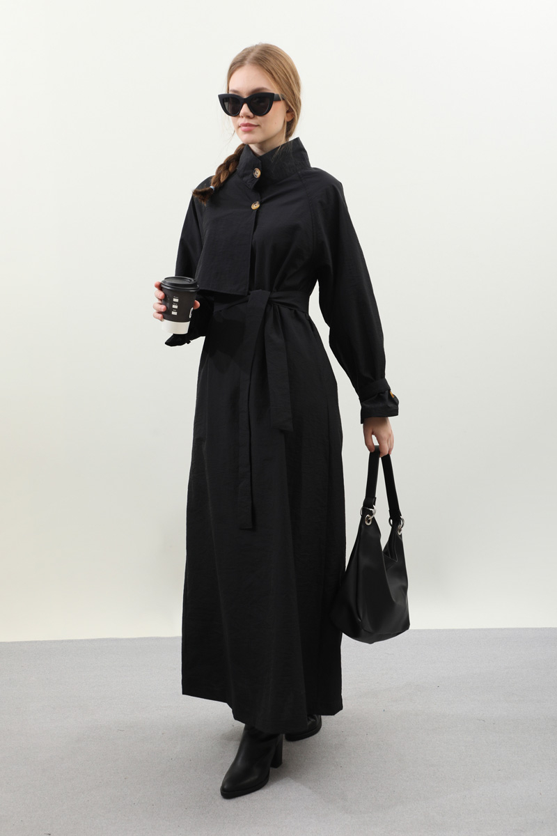 Yarım Rüzgarlıklı Paraşüt Elbise Siyah. Balıkçı yakadır, önden düğmelidir, reglan kolludur, hareketli rüzgarlık detaylıdır, manşetleri ayarlanabilir kemerlidir, astarlıdır, yandan ceplidir, kuşaklıdır, Günlük kullanım ve özel günlerinizde tercih edebilirsiniz.