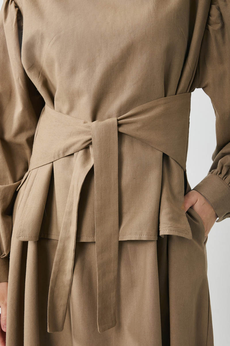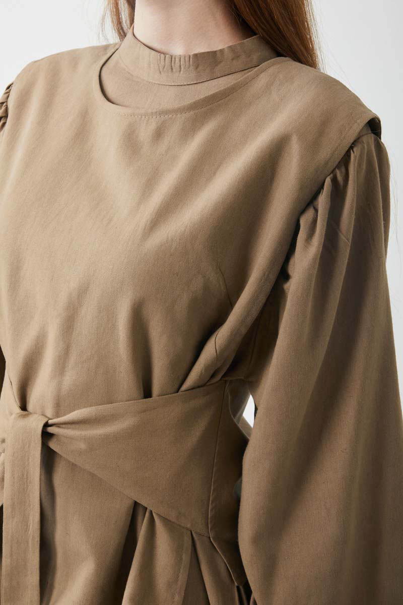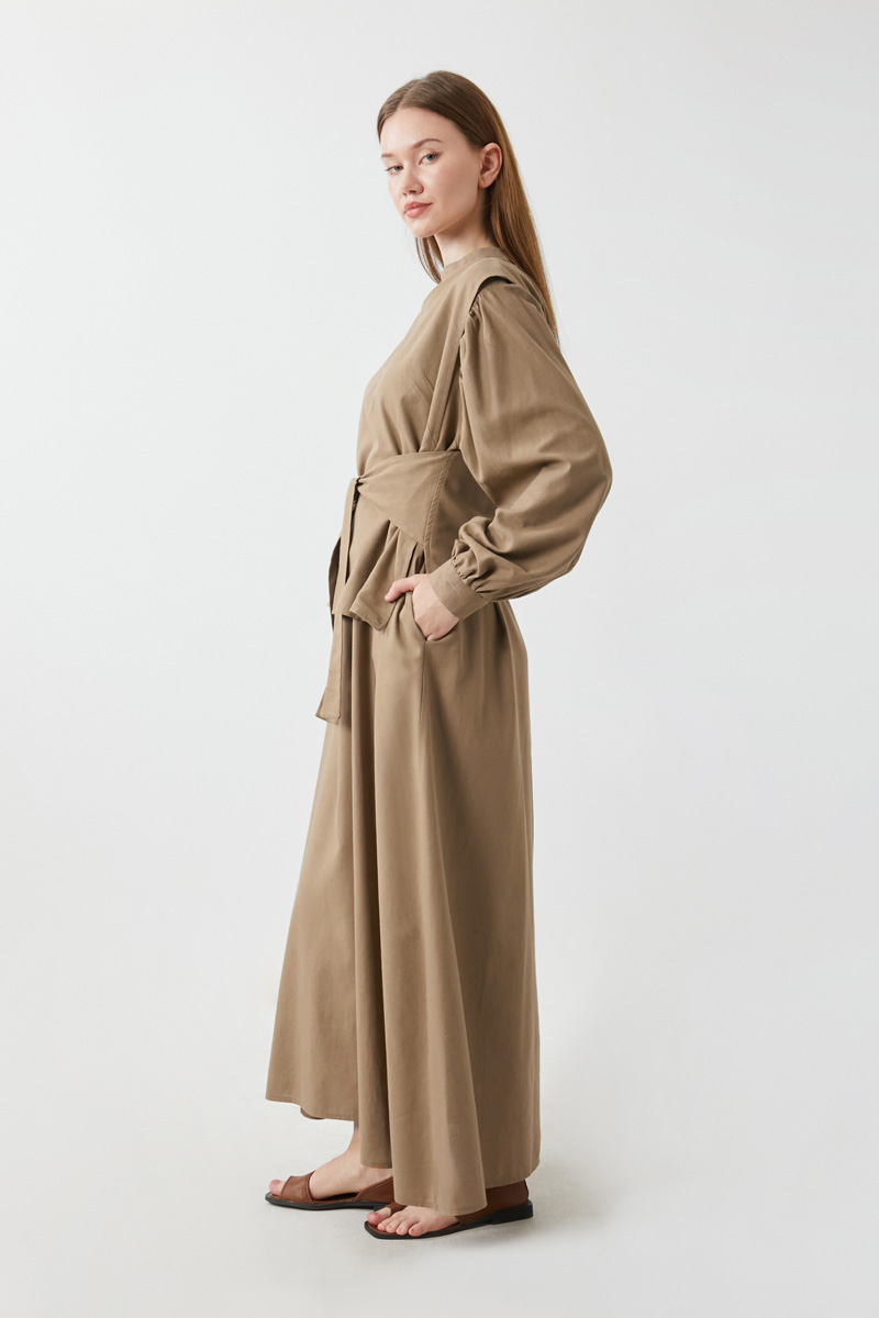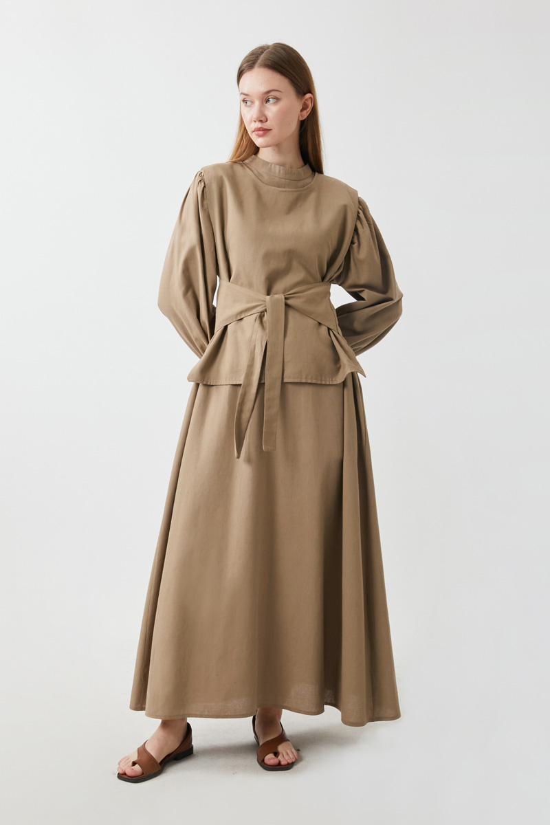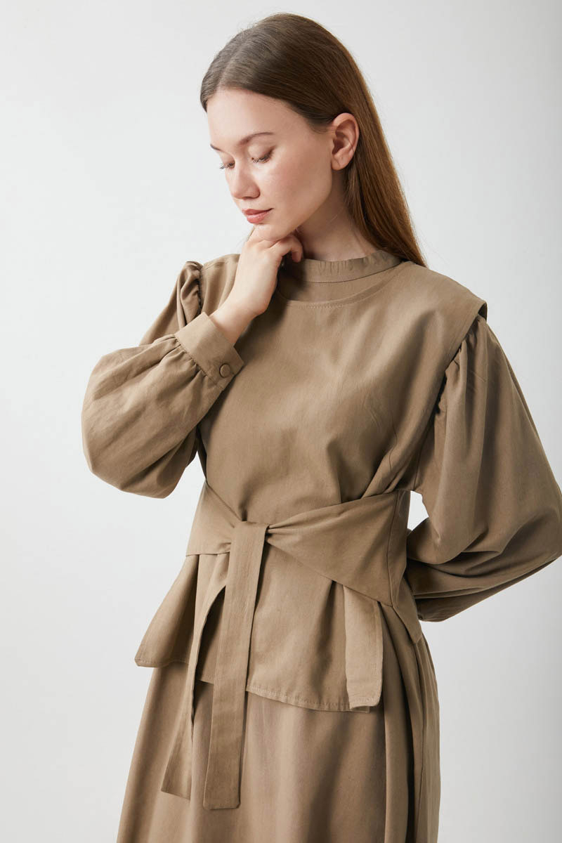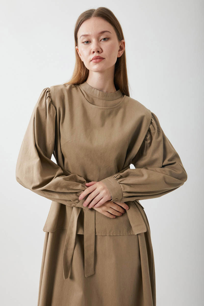 Yeleği Bağlamalı Elbise Takım Camel. elbise bisiklet yakadır, omuzlarından büzgü detaylı olup balon kolludur, manşetlidir, yandan ceplidir, astarsızdır. Yelek bisiklet yakadır, arkadan öne doğru bağlama detaylıdır. Günlük kullanım ve özel günlerinizde tercih edebilirsiniz.