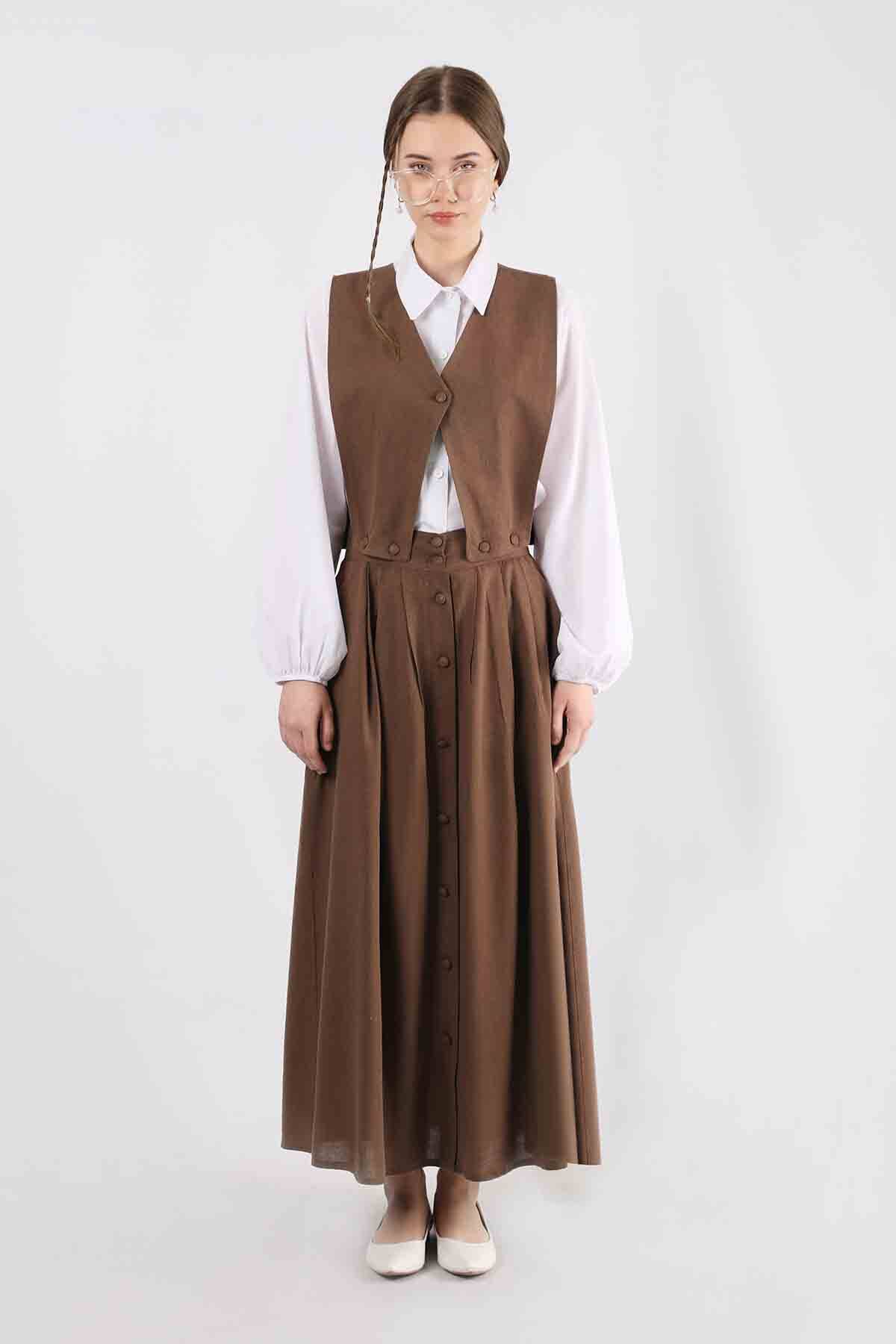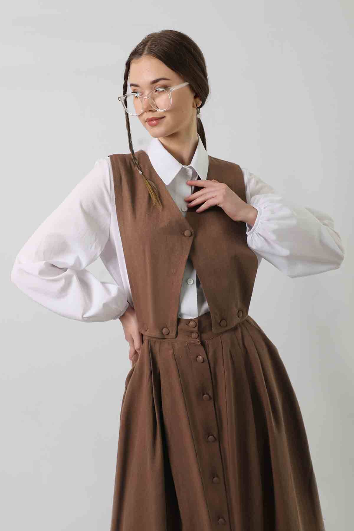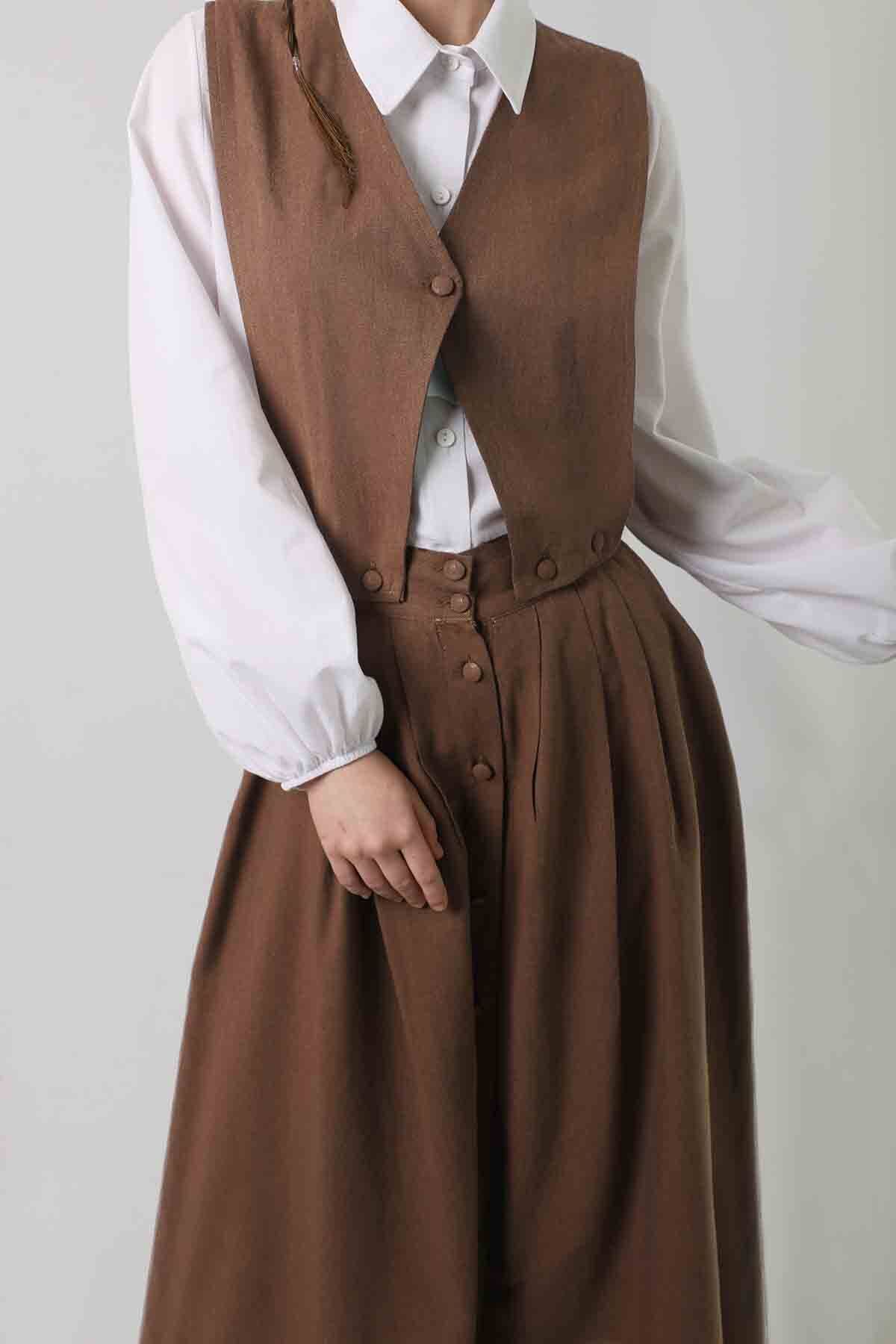 Yelek Detaylı Etek Takım Kahve