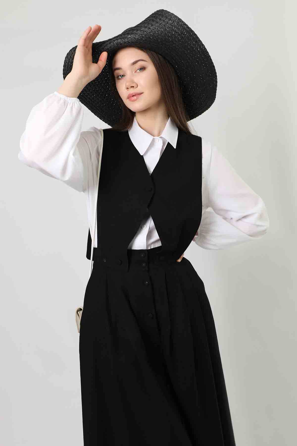 Yelek Detaylı Etek Takım Siyah. Terikoton gömlek. Etek belinden pilelidir. Ceplidir. Gömlek kol lastiklidir. Kaplama düğmelidir. Normal kalıptır. Üçlü takım olarak satılmaktadır. Özel günlerinizde tercih edebilirsiniz