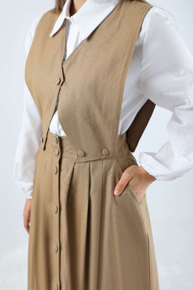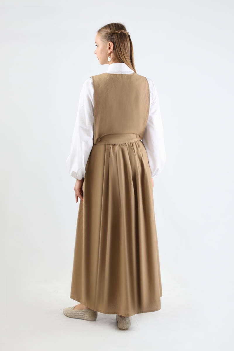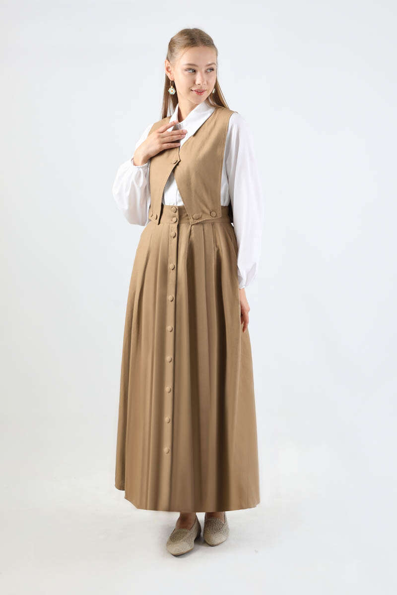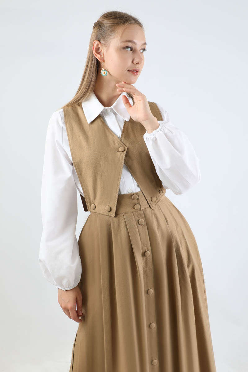 Yelek Detaylı Etek Takım Taba. Terikoton gömlek. Etek belinden pilelidir. Ceplidir. Gömlek kol lastiklidir. Kaplama düğmelidir. Normal kalıptır. Üçlü takım olarak satılmaktadır. Özel günlerinizde tercih edebilirsiniz.