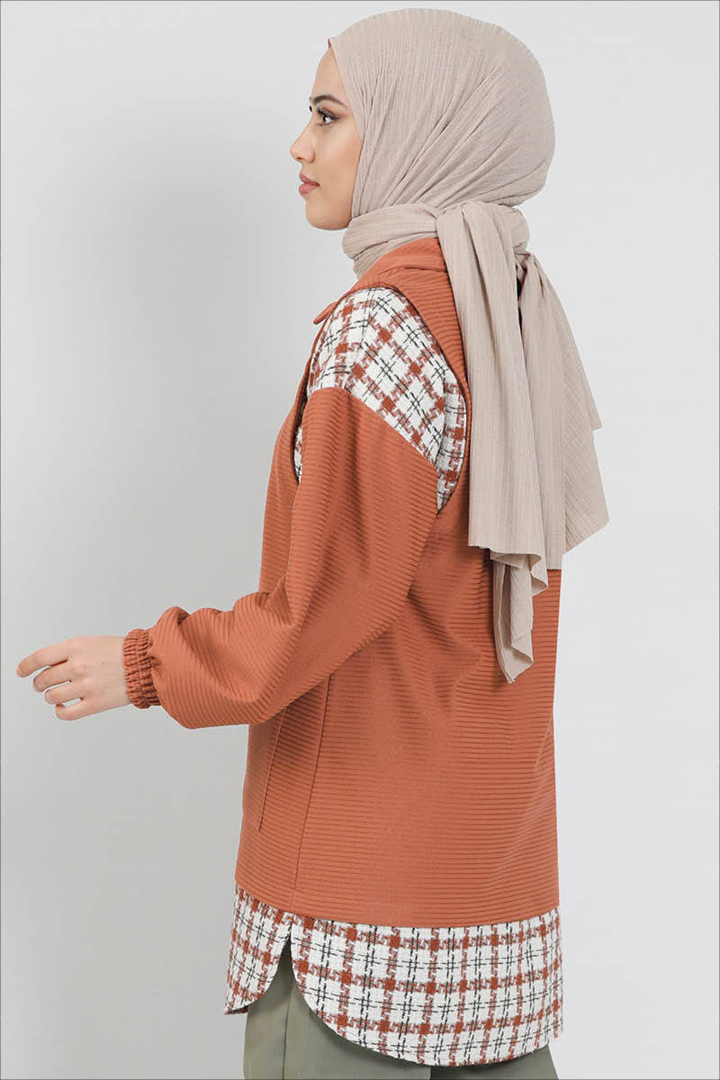 Gömlek yaka, önden iki cepli, ekose kumaş detaylı, yelek görünümlü.