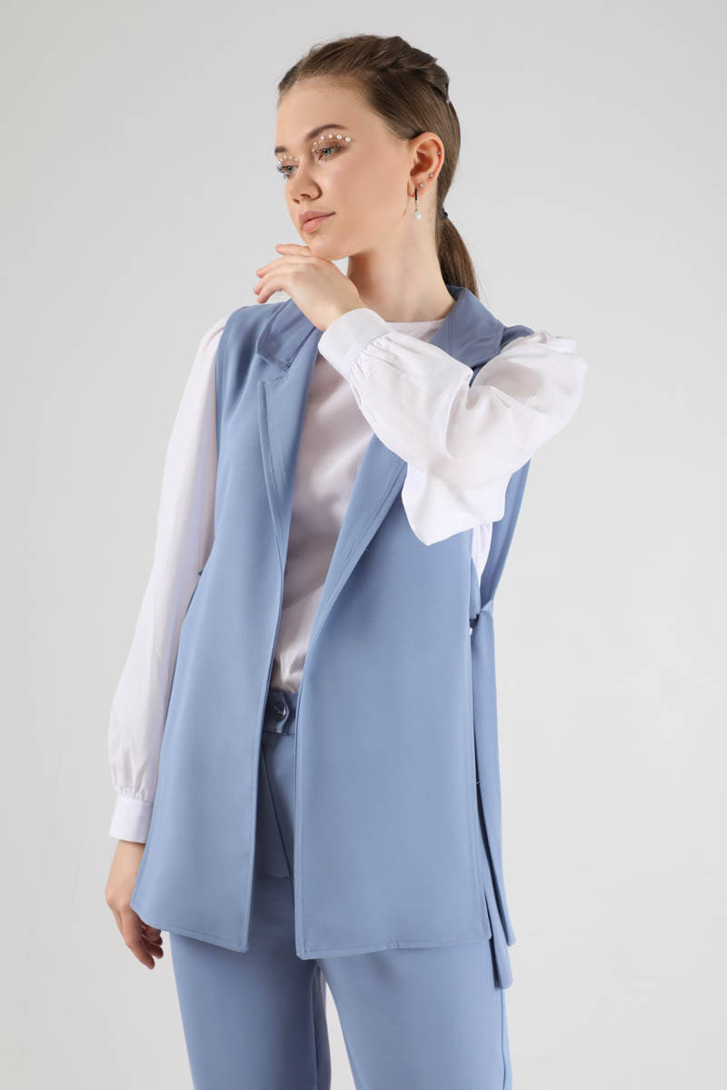 Yelek Tunik Takım Bebe Mavisi, cepleri aktiftir, Yelek Yandan Bağlamalıdır . yandan ceplidir. Tam kalıptır. Gömlek, yelek ve pantolon olmak üzere Üçlü Takım Olarak Satılmaktadır.