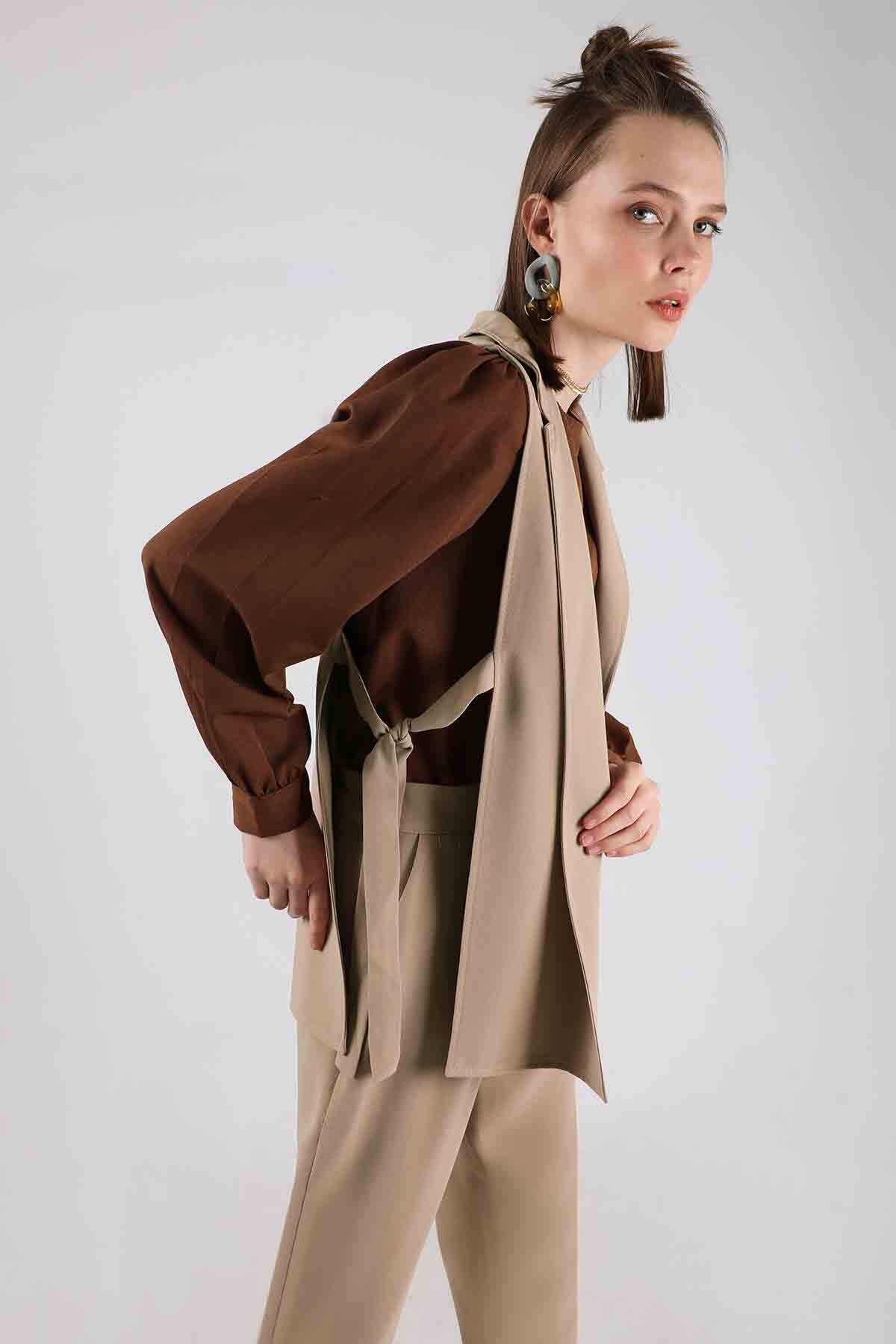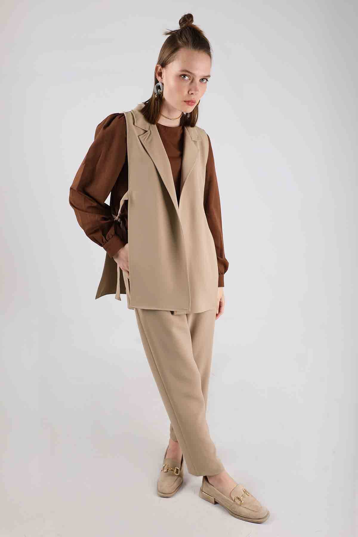 Yelek Tunik Takım Camel, cepleri aktiftir, Yelek Yandan Bağlamalıdır . yandan ceplidir. Tam kalıptır.Gömlek, yelek ve pantolon olmak üzere Üçlü Takım Olarak Satılmaktadır.