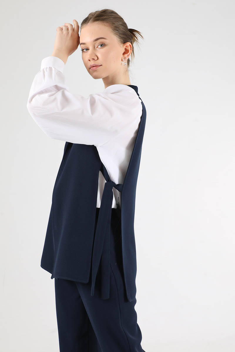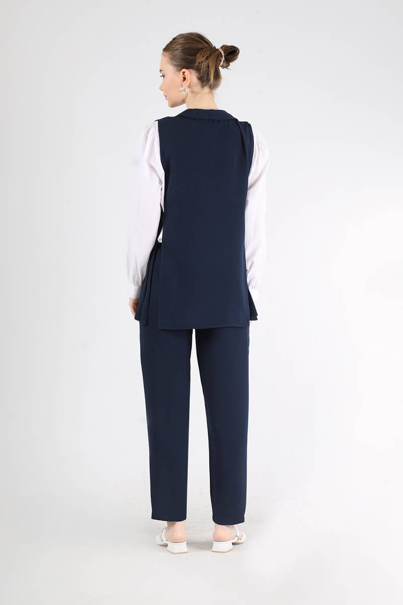 Yelek Tunik Takım Lacivert, cepleri aktiftir, Yelek Yandan Bağlamalıdır . yandan ceplidir. Tam kalıptır. Gömlek, yelek ve pantolon olmak üzere Üçlü Takım Olarak Satılmaktadır.