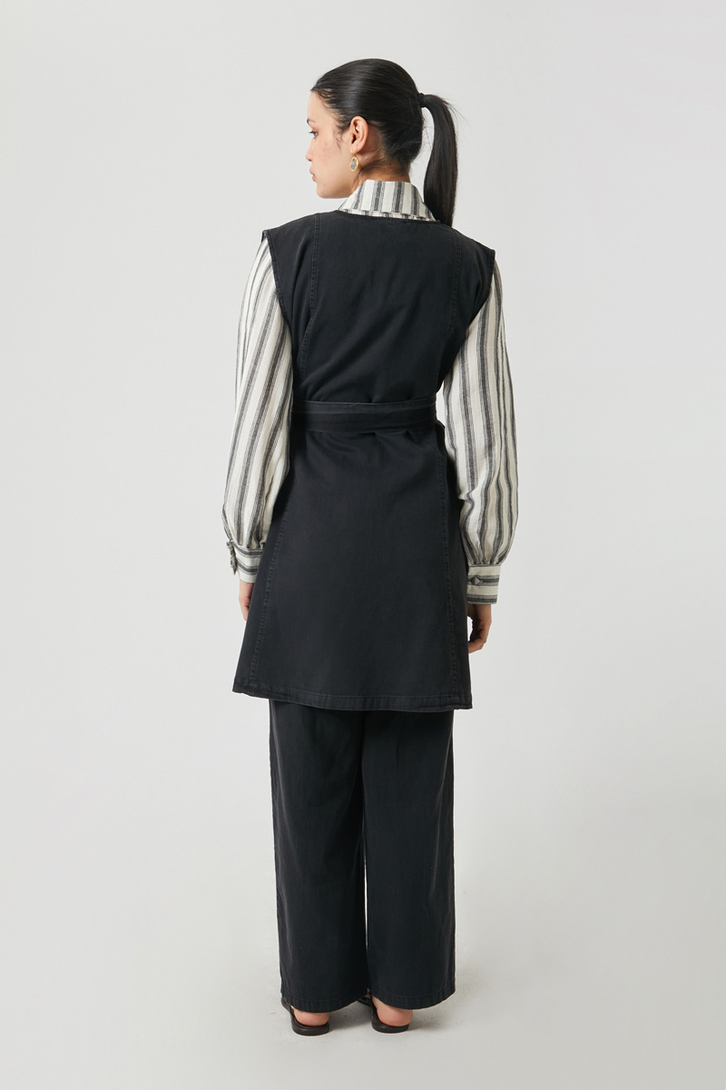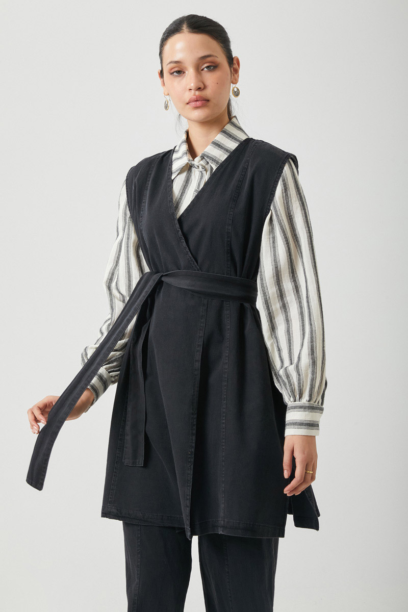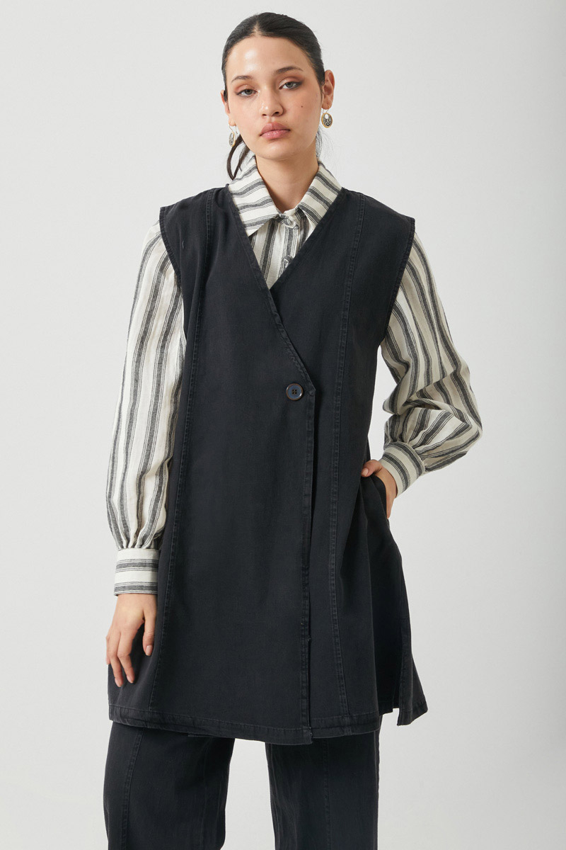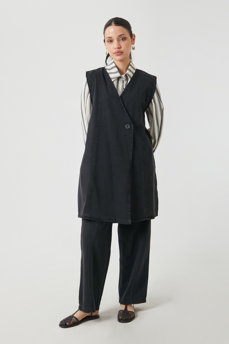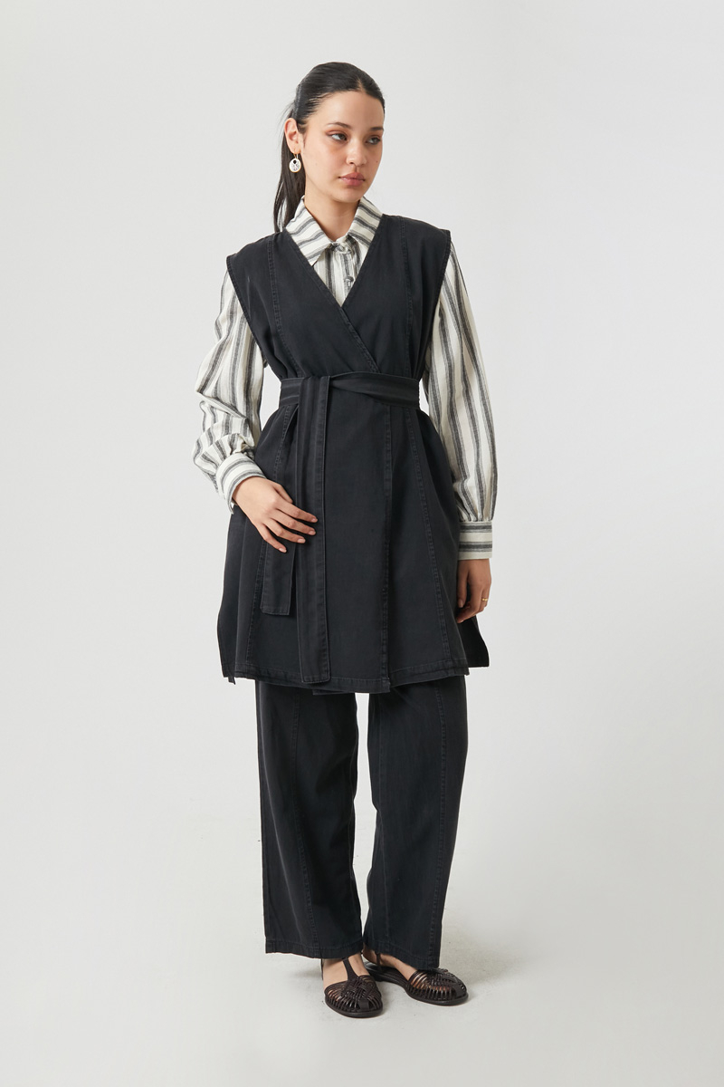 Yelekli Denim Takım Açık Mavi. Yelek kruvaze yakadır, yandan ceplidir, önden tek düğmelidir, yelek kuşaklıdır, Pantolon arka belden lastiklidir, yandan ceplidir, yelek ve pantolon dikiş detaylı olup ikili takım olarak satılmaktadır. Günlük kullanım ve özel günlerinizde tercih edebilirsiniz.