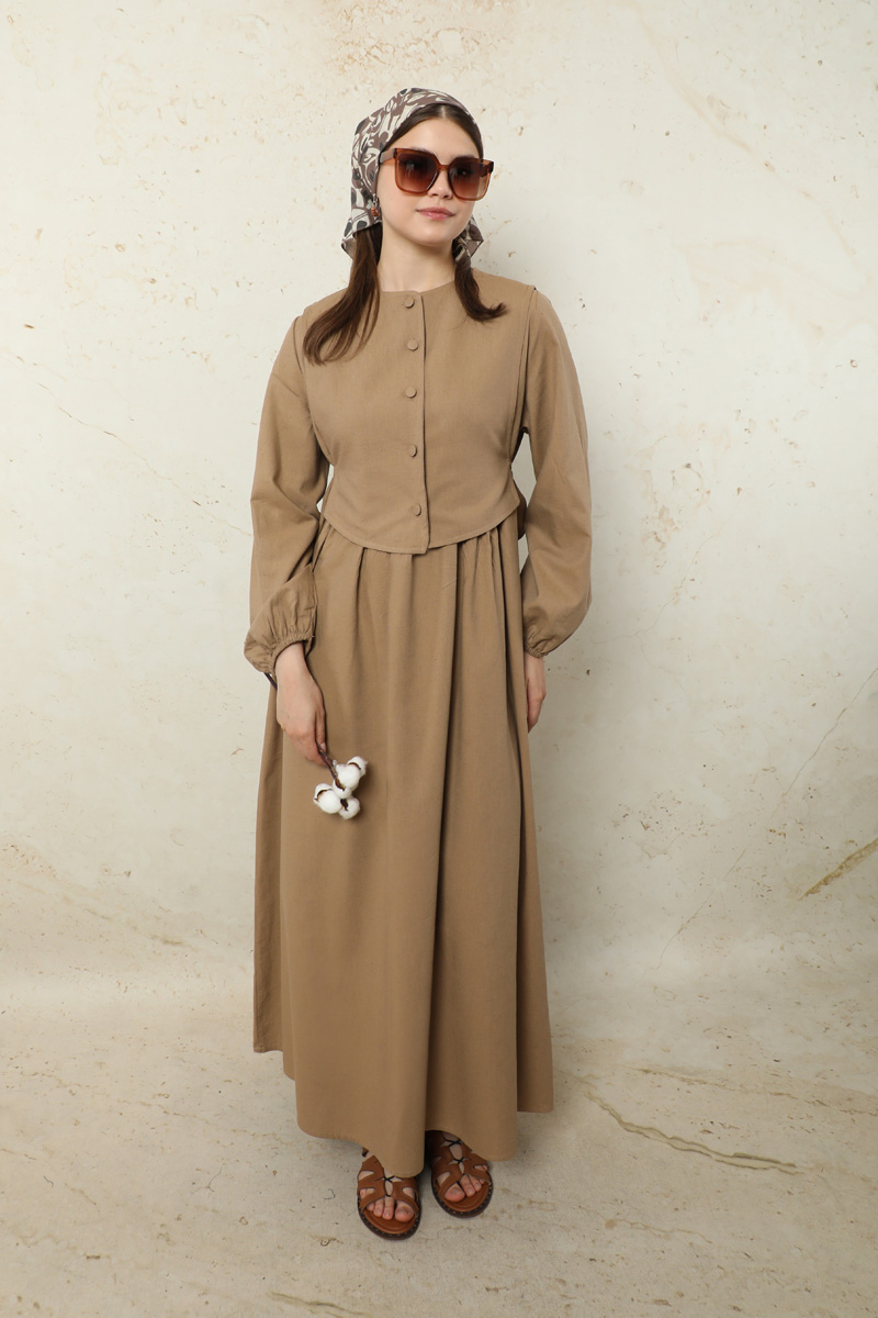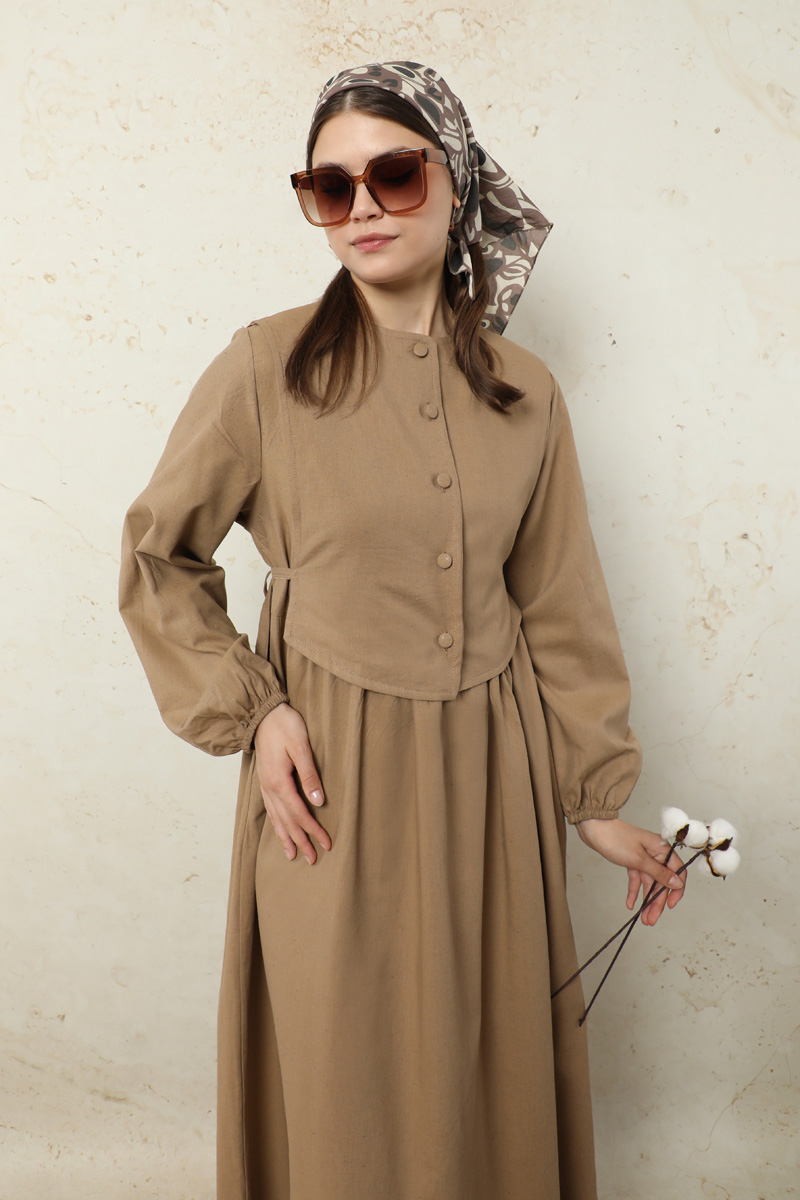 Yelekli Keten Elbise Camel. Seyyar yelek detaylıdır. Yelek önden düğmelidir. yandan biyeli, arkadan bağlanılabilir kullanımındadır. Elbise arkası yaka düğme detaylıdır. Elbise yandan cepli. Manşeti lastiklidir. Günlük kullanım ve özel günlerinizde tercih edebilirsiniz.