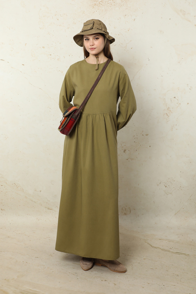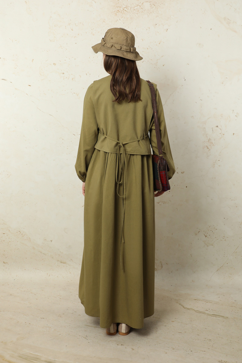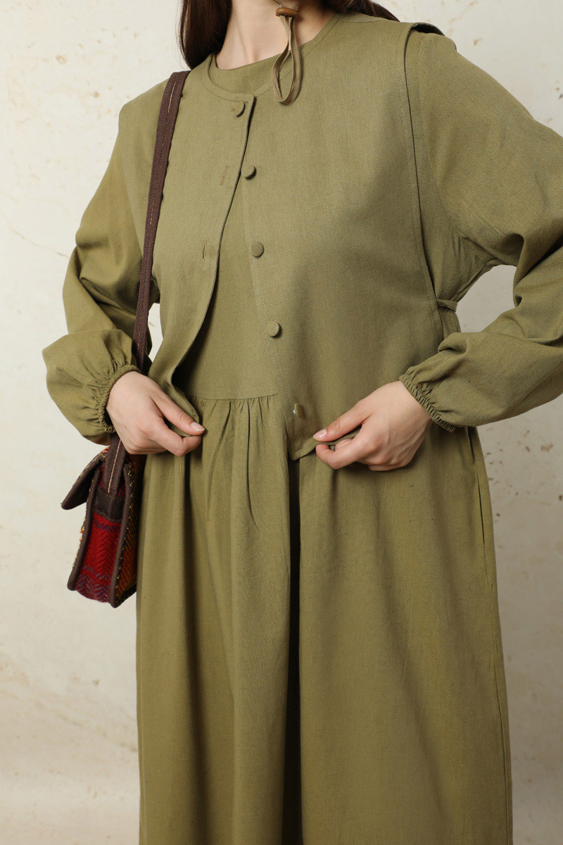 Yelekli Keten Elbise Haki. Seyyar yelek detaylıdır. Yelek önden düğmelidir. yandan biyeli, arkadan bağlanılabilir kullanımındadır. Elbise arkası yaka düğme detaylıdır. Elbise yandan cepli. Manşeti lastiklidir. Günlük kullanım ve özel günlerinizde tercih edebilirsiniz.