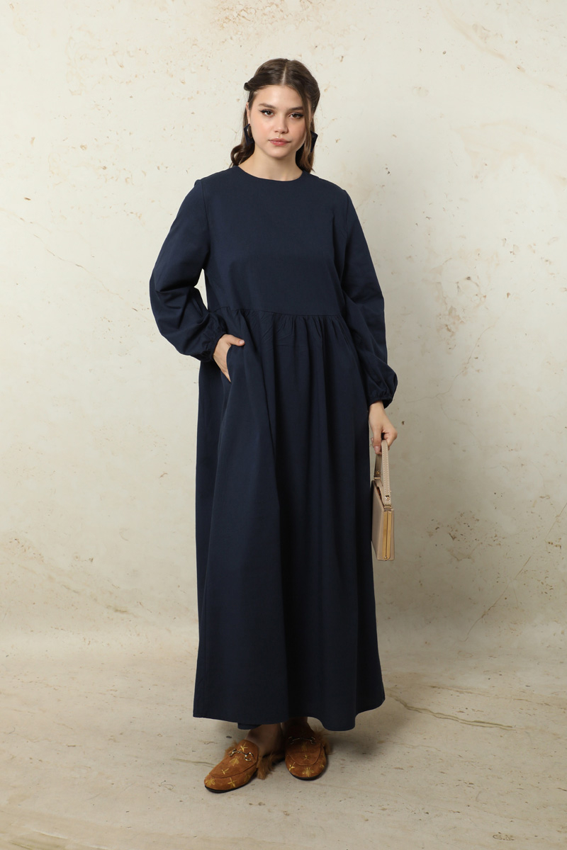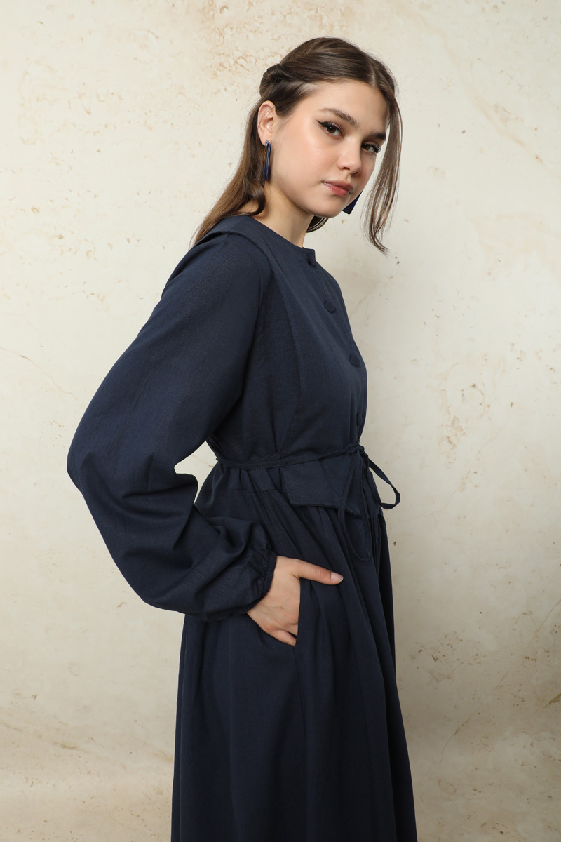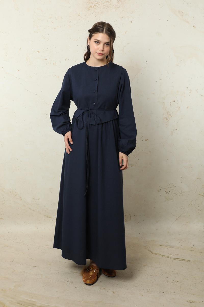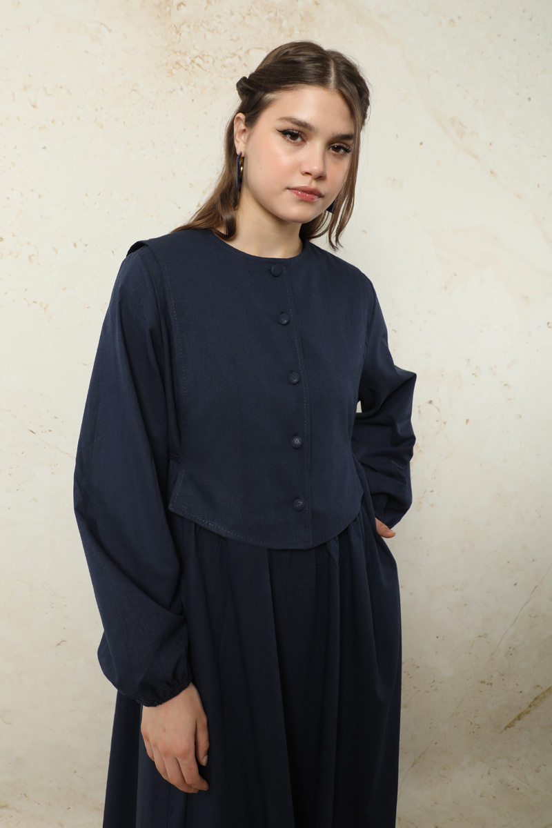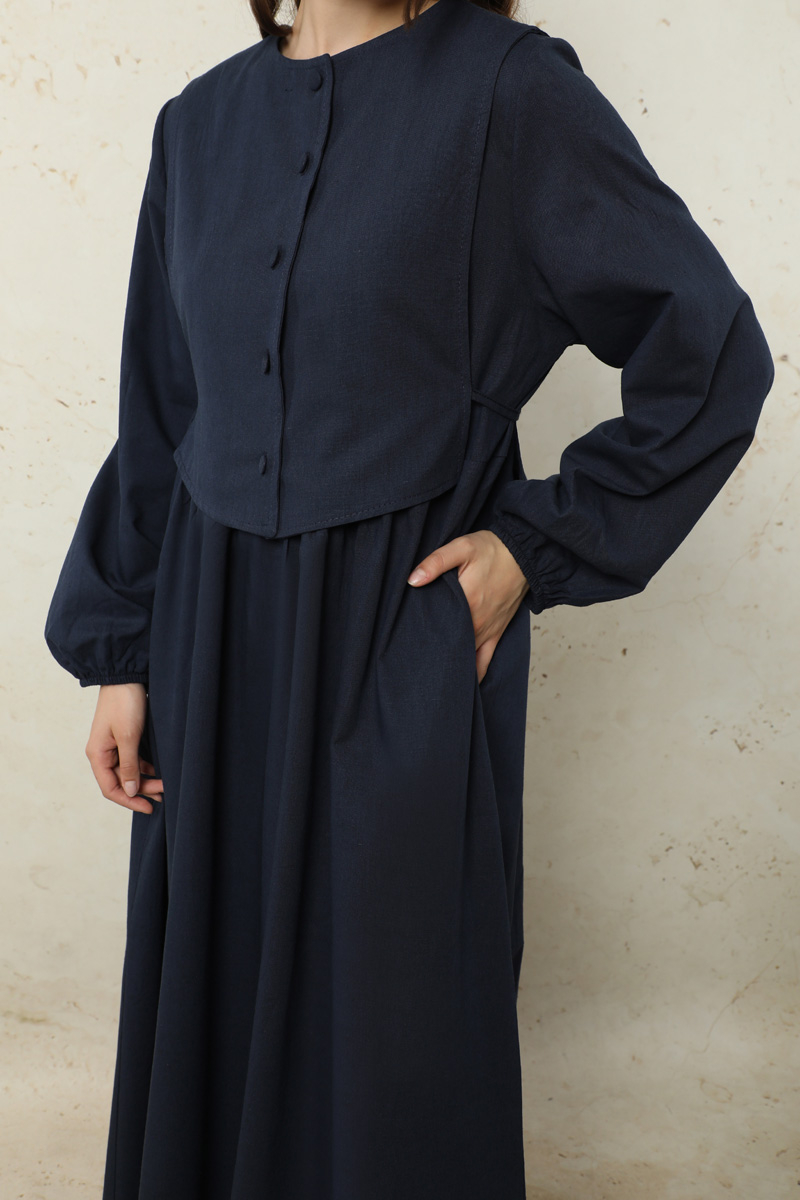 Yelekli Keten Elbise Lacivert. Seyyar yelek detaylıdır. Yelek önden düğmelidir. yandan biyeli, arkadan bağlanılabilir kullanımındadır. Elbise arkası yaka düğme detaylıdır. Elbise yandan cepli. Manşeti lastiklidir. Günlük kullanım ve özel günlerinizde tercih edebilirsiniz.