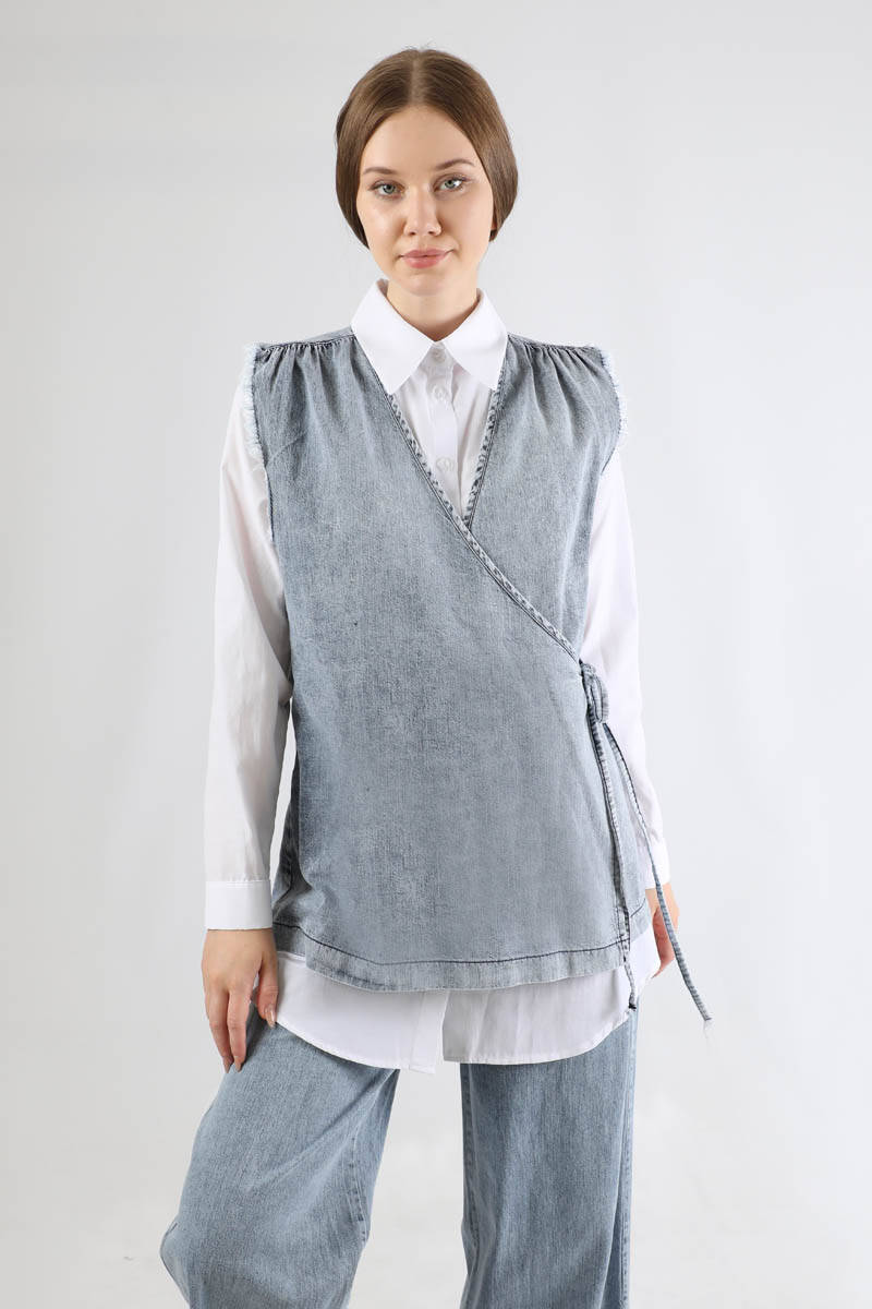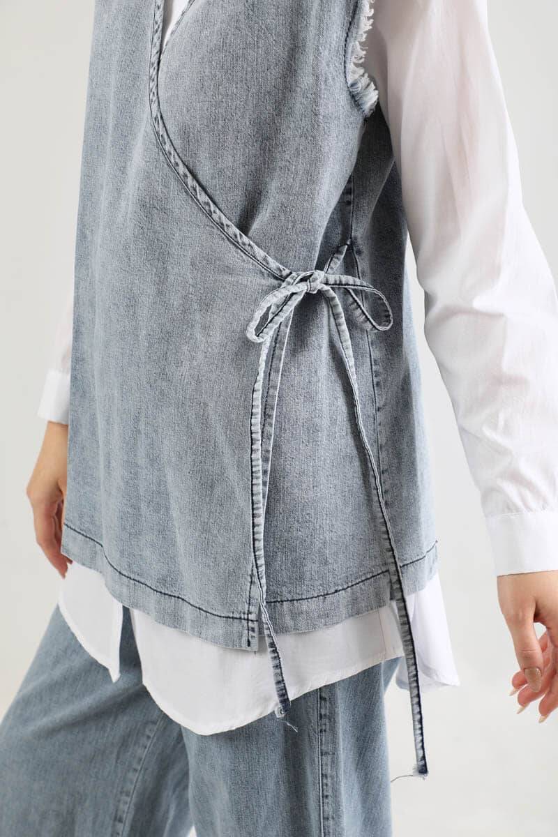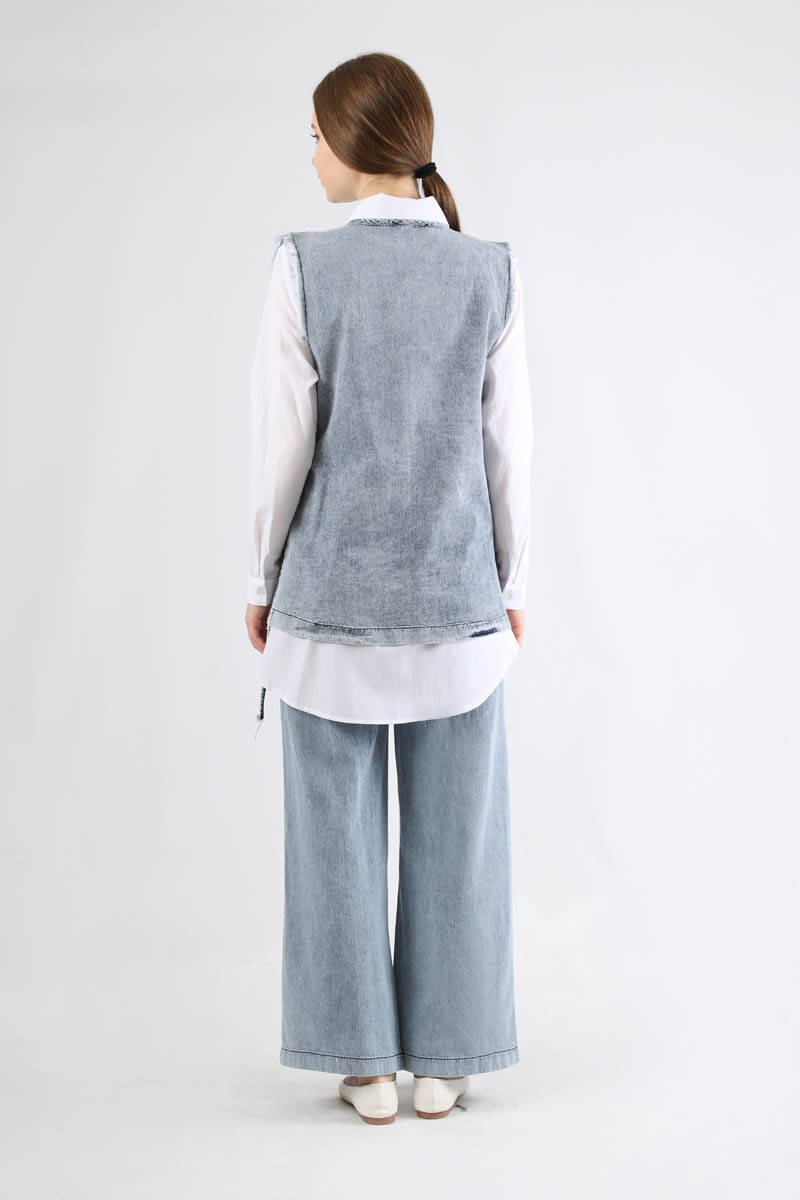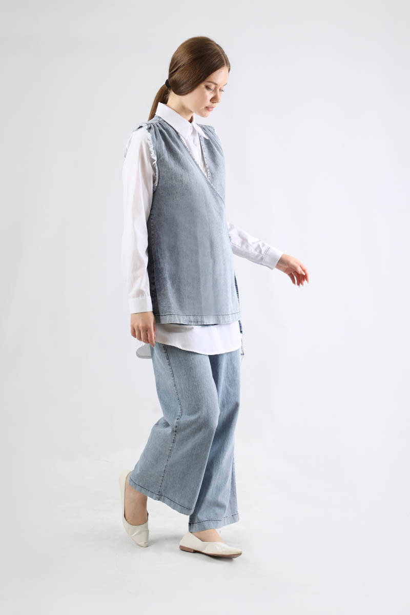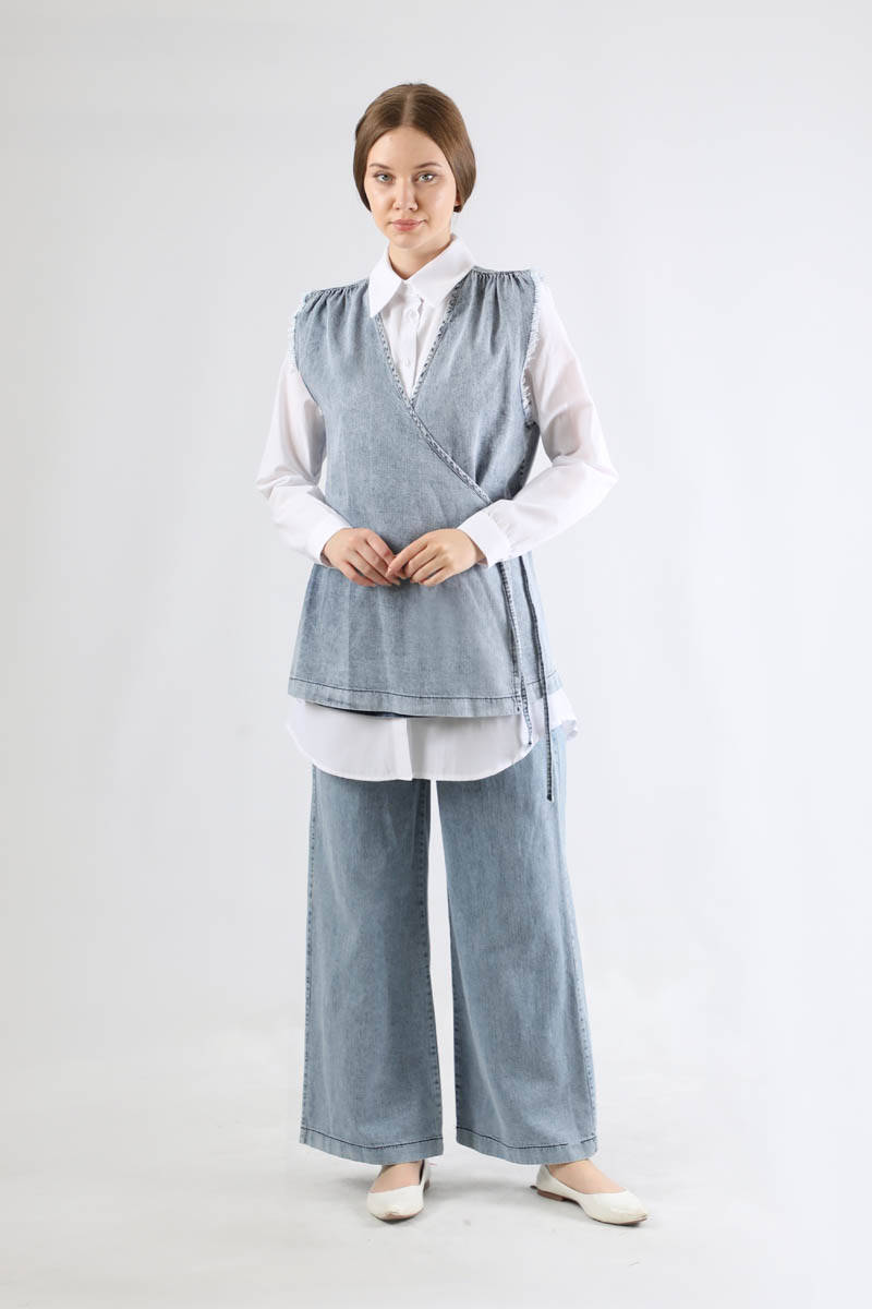 Yelekli Kot Takım Açık Mavi. Yelek yandan bağlamalıdır. Omuz büzgü detaylıdır. Yelek kol evi püskül detaylıdır. Ceplidir. Pantolon bol paçadır. Günlük kullanım ve özel günlerinizde tercih edebilirsiniz.