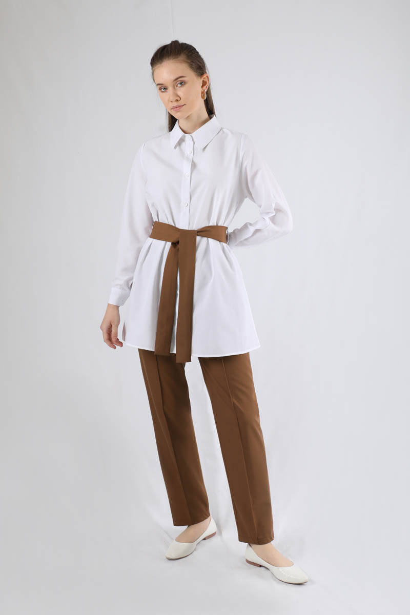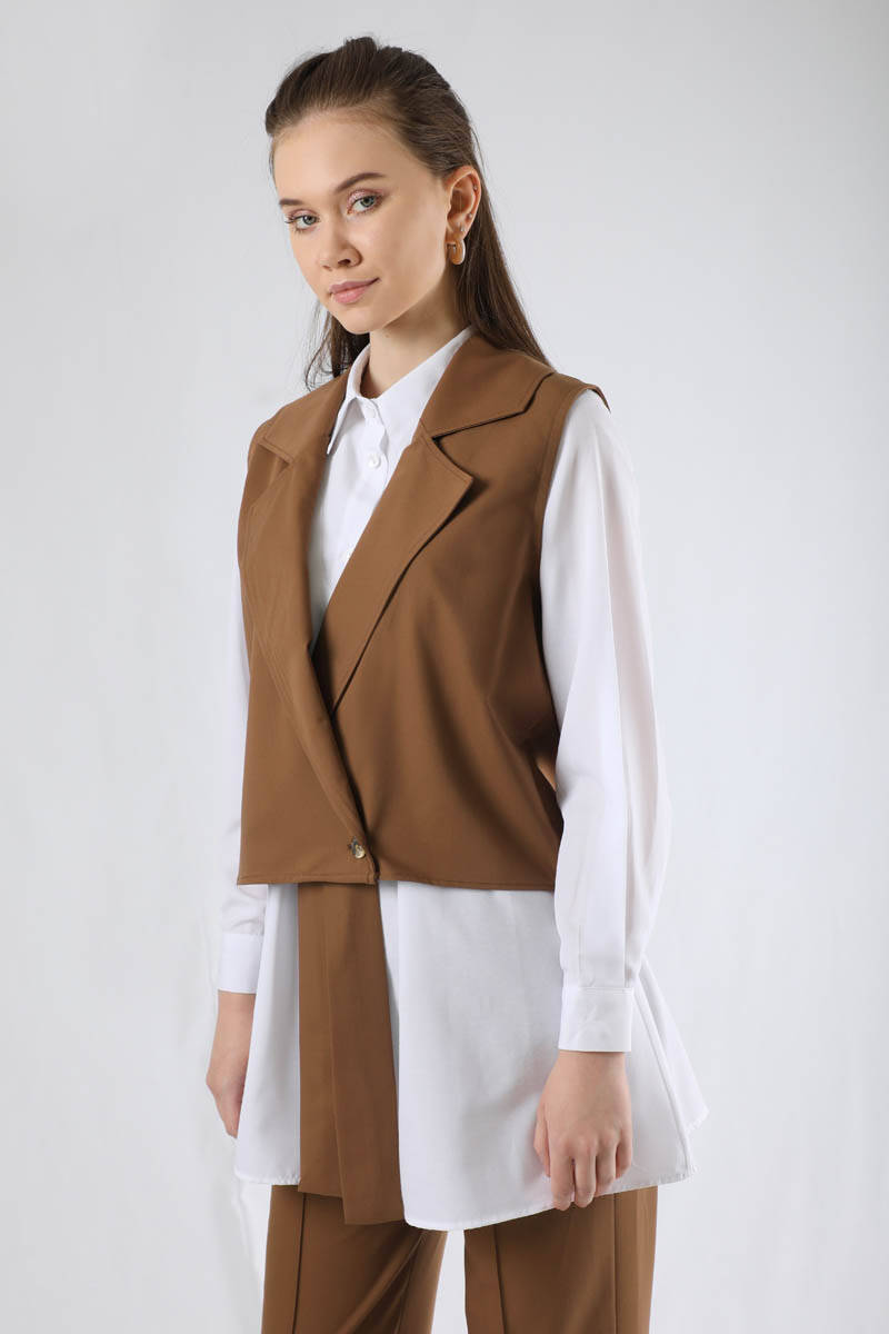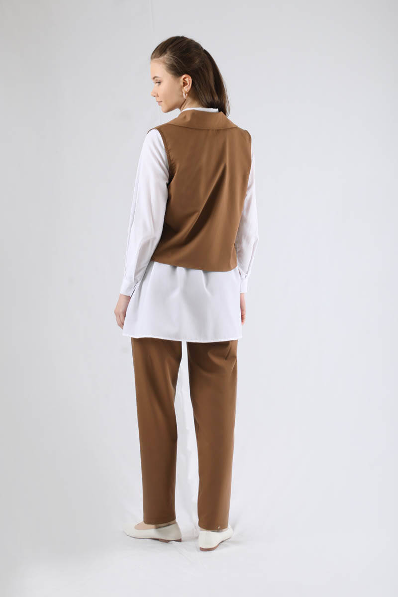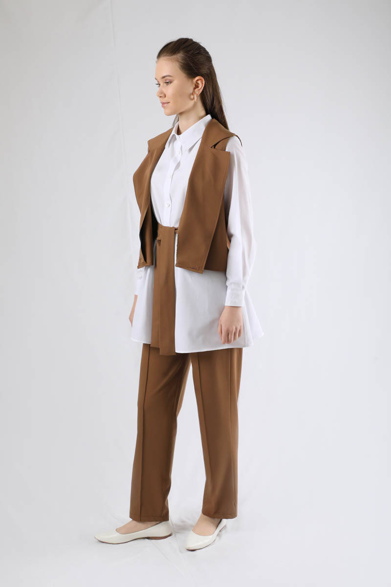 Yelekli Kuşaklı Üçlü Takım Kahve
