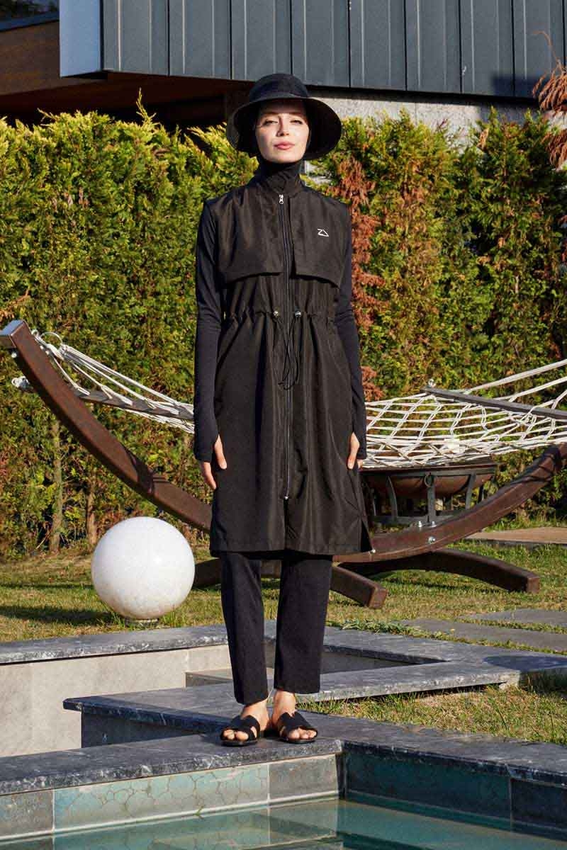 Yelekli Tesettür Mayo Siyah.Hakim yakalıdır, ürünün bel kısmında ayarlanabilir stoper mevcuttur, rüzgarlıklıdır, yandan kısa yırtmaçlıdır, önden gizli fermuarlıdır, gizli ceptir. İç body bilek kısmı, parmak geçme detayına sahiptir.Sudan çıkıldığında kısa süre içerisinde kurur ve bu sayede ürün üzerinize yapışmaz.Paket İçeriği:İç body, tayt, üst tunik, bonesi ve çantası olarak satılmaktadır. (Şapka takıma dahil değildir.)