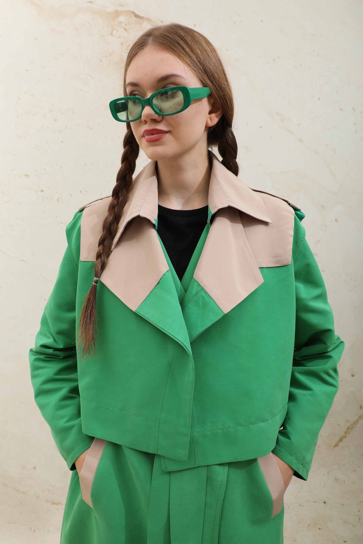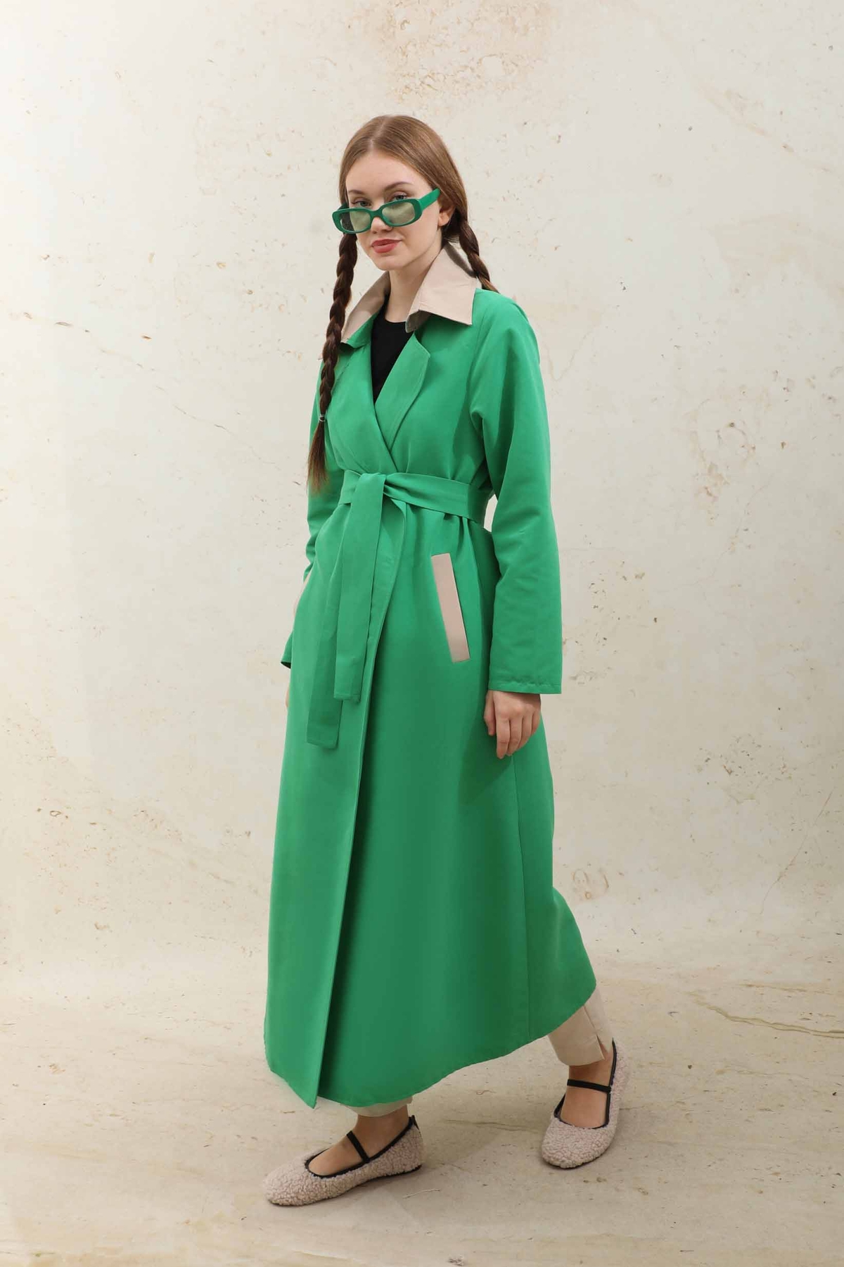 Yelekli Trençkot Yeşil. İngiliz yaka olup seyyar kuşaklıdır.Yeleklidir. İsteğe bağlı yelek ve treç ayrı olarak kullanılabilir. Trençkot belden kuşaklıdır ve cep detaylıdır. Ürün astarsızdır.