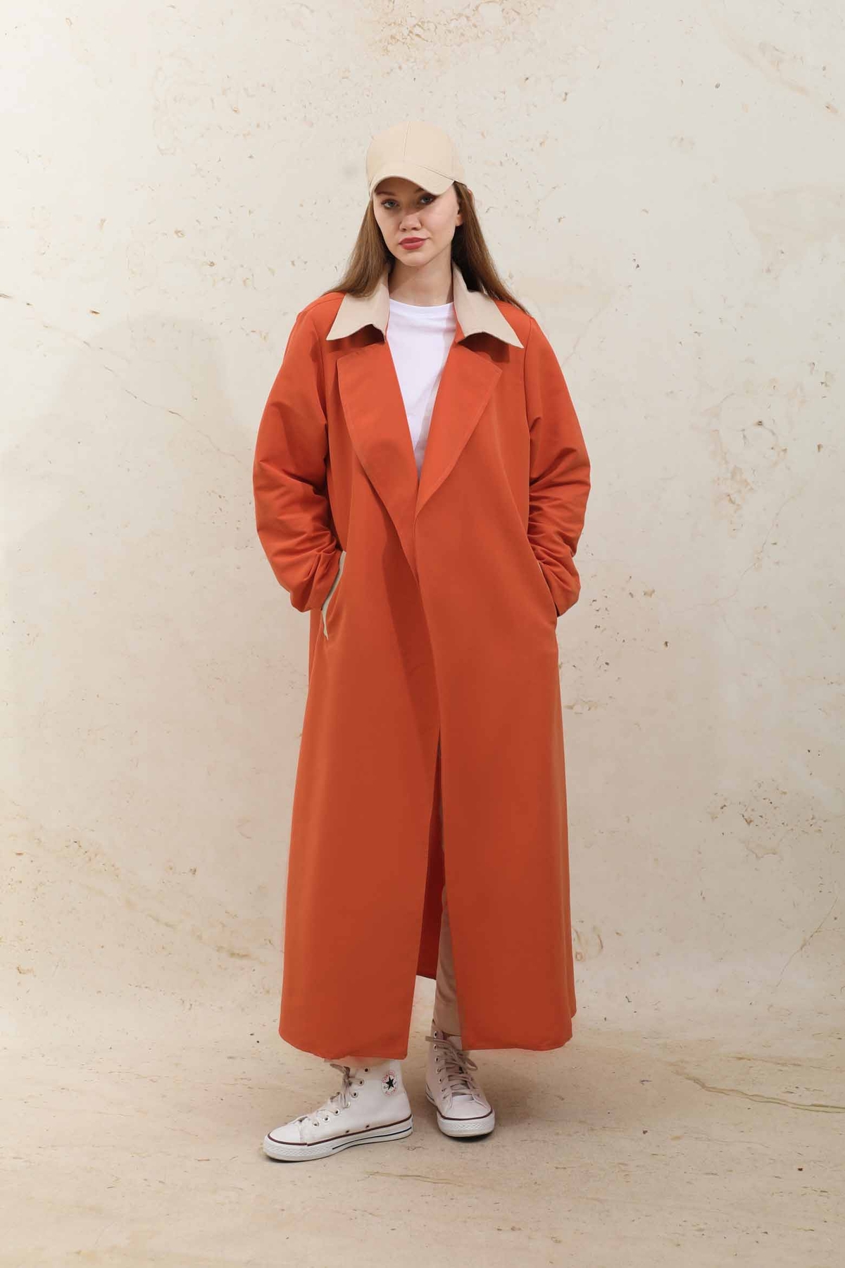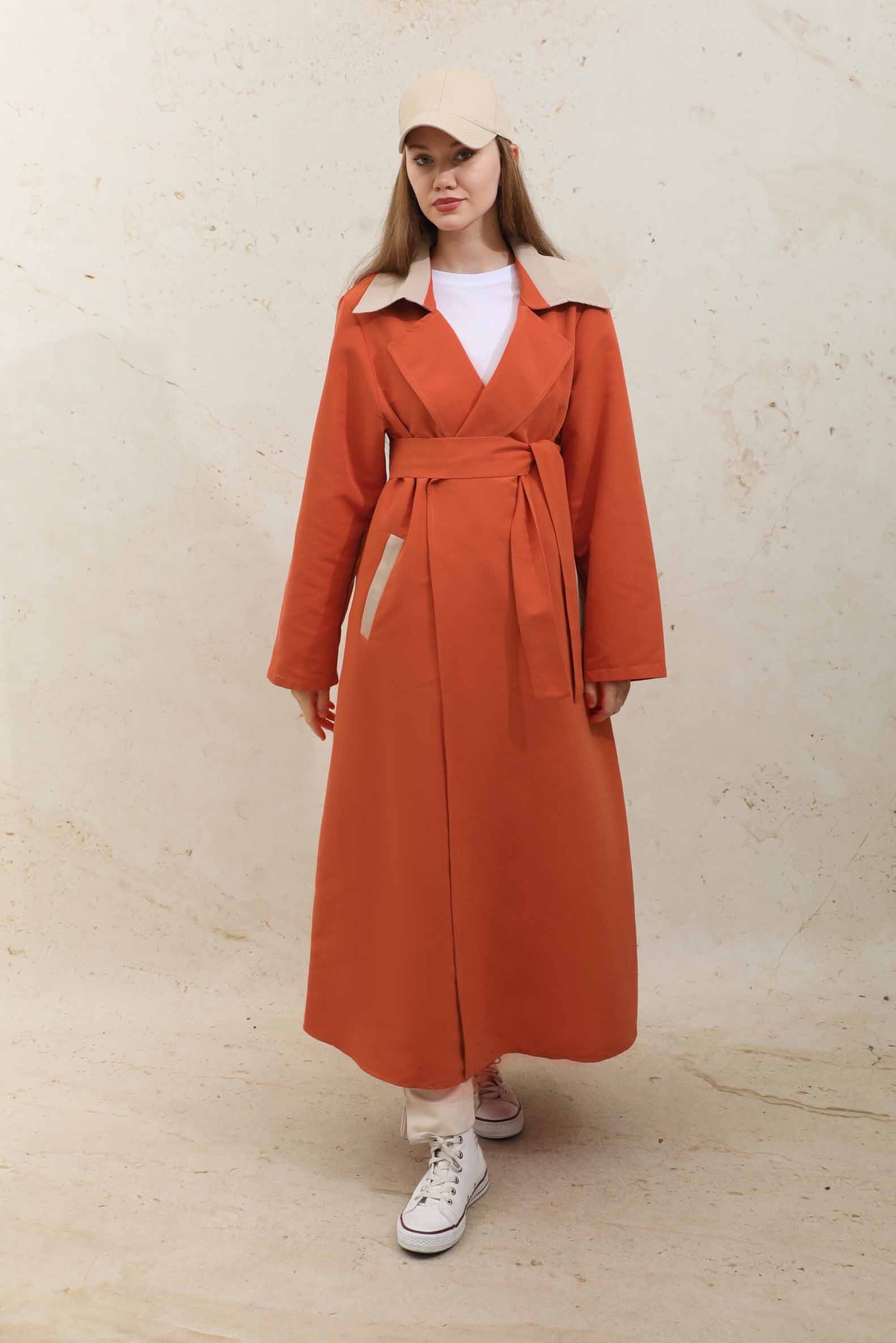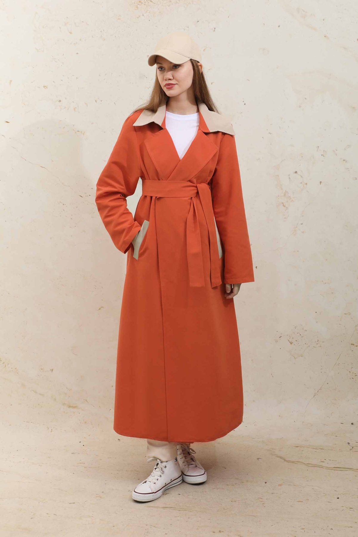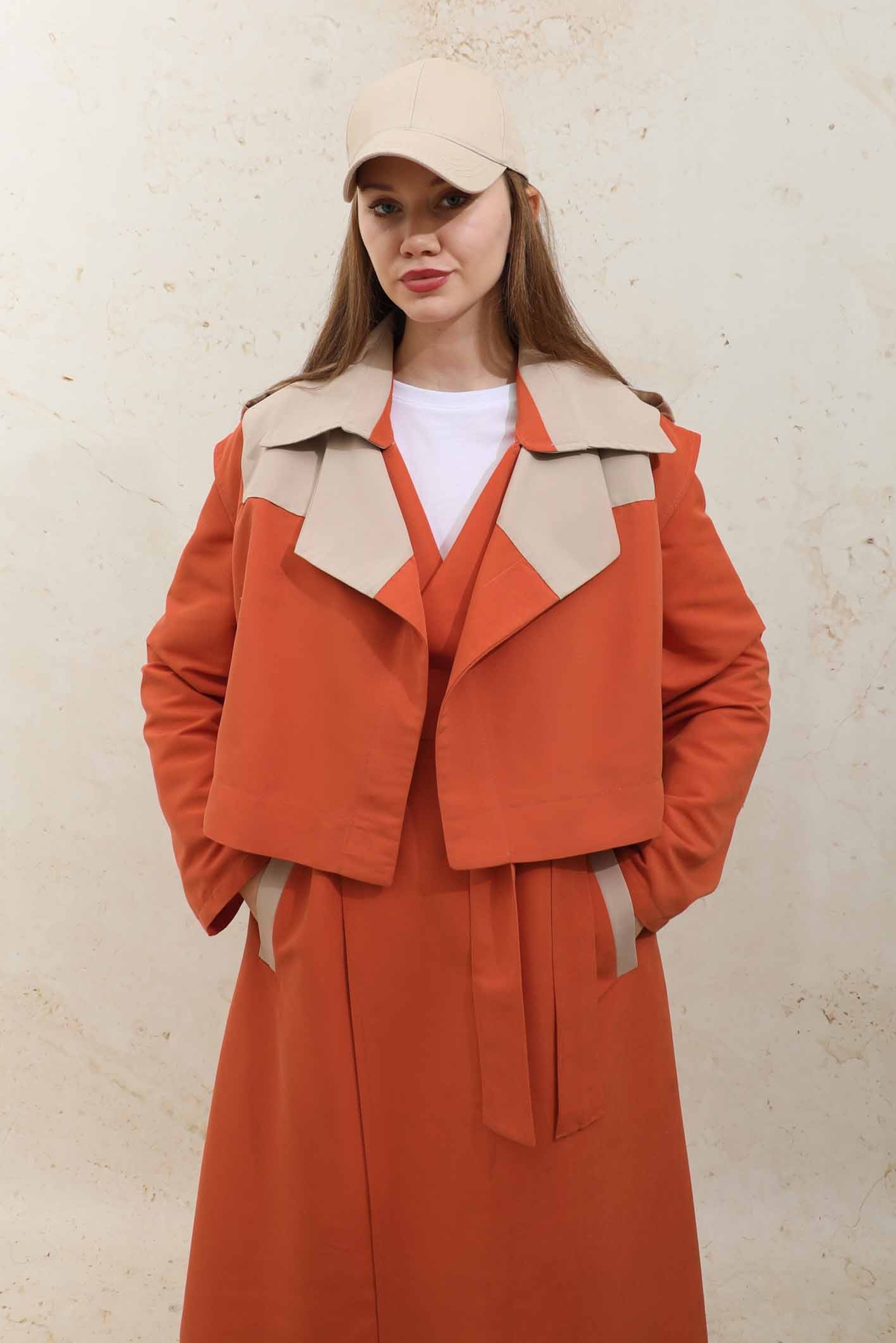 Yelekli Trençkot Turuncu. İngiliz yaka olup seyyar kuşaklıdır.Yeleklidir. İsteğe bağlı yelek ve treç ayrı olarak kullanılabilir. Trençkot belden kuşaklıdır ve cep detaylıdır. Ürün astarsızdır.