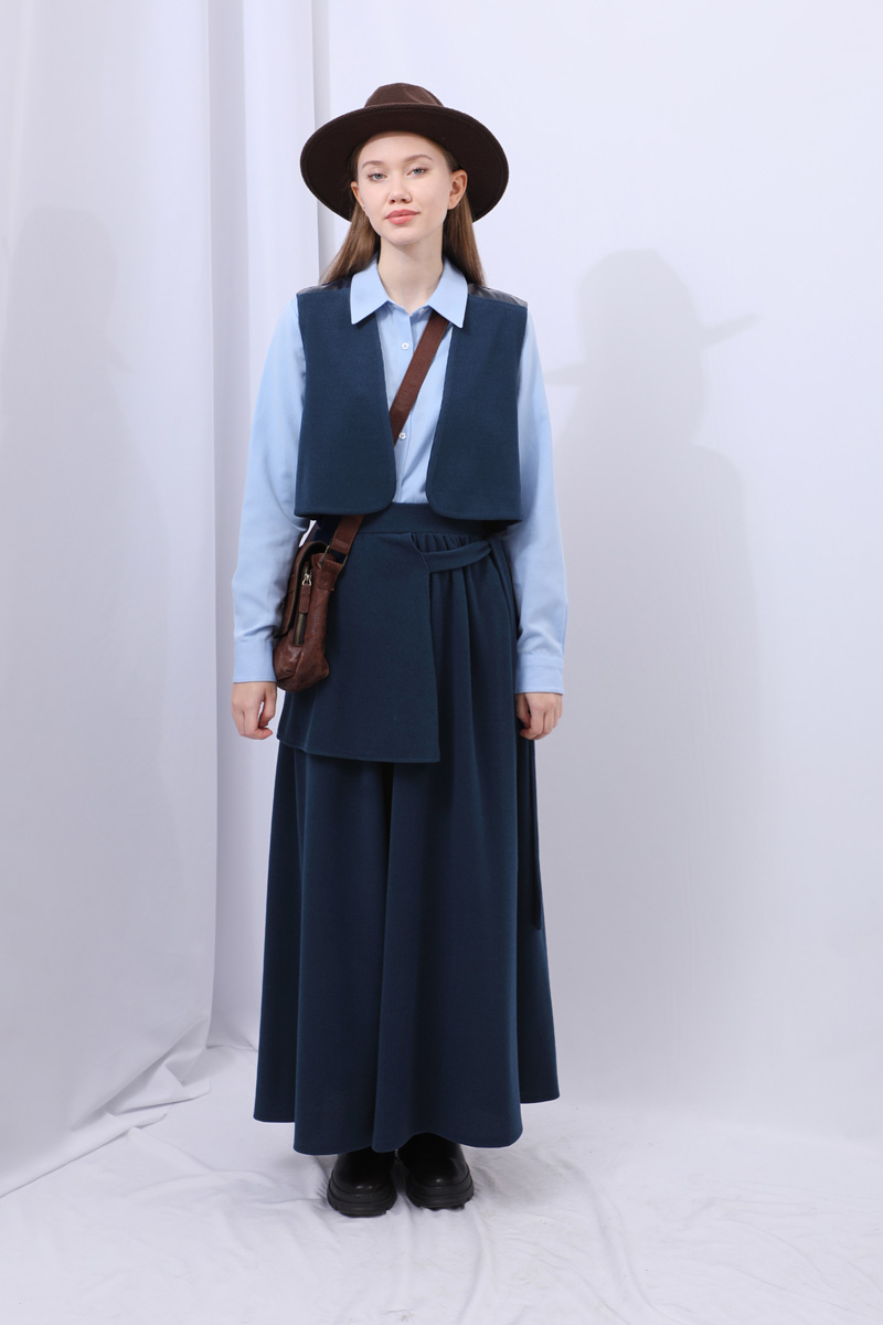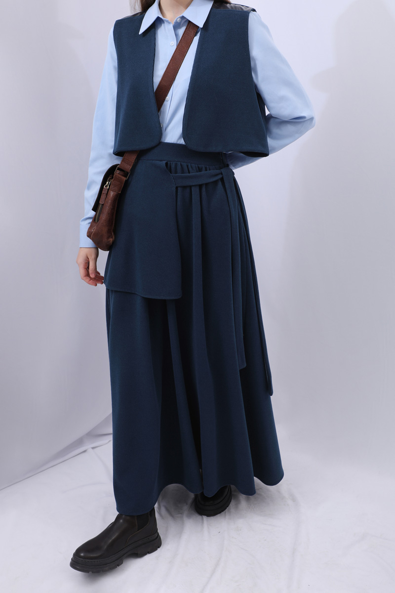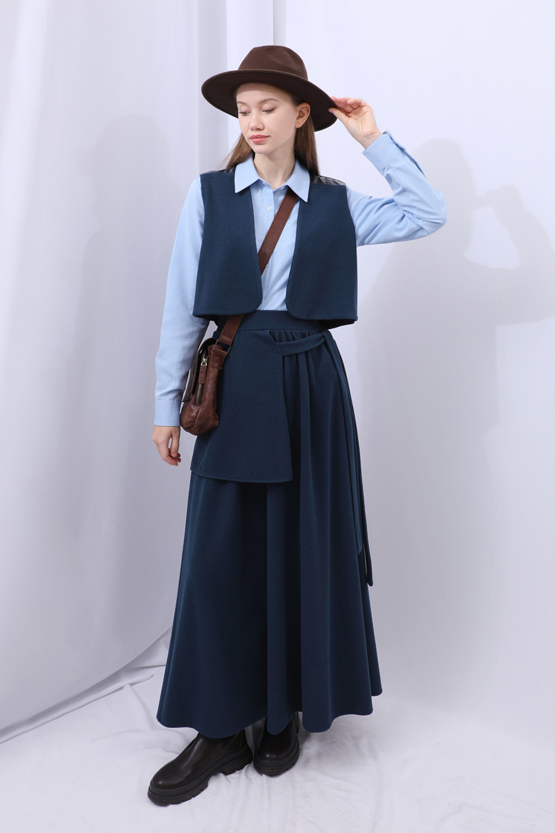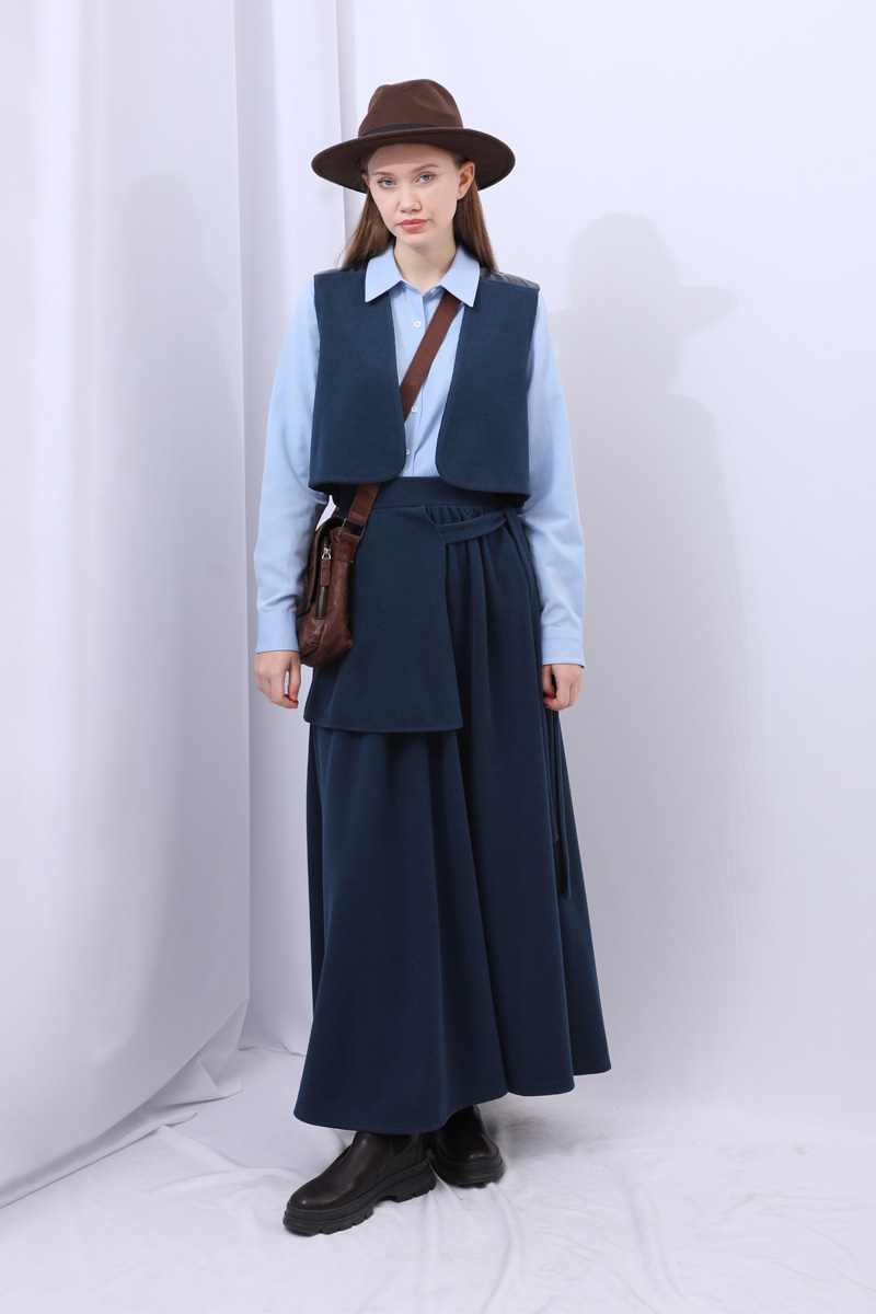 Yelekli Triko Takım Lacivert. Yelek omuzdan parça deri detaylıdır, etek yandan bağlamalı parça detaylıdır, yandan fermuarlıdır, cepsizdir, kloş kesimdir, astarsızdır, iç göstermez. Günlük kullanım ve özel günlerinizde tercih edebilirsiniz.