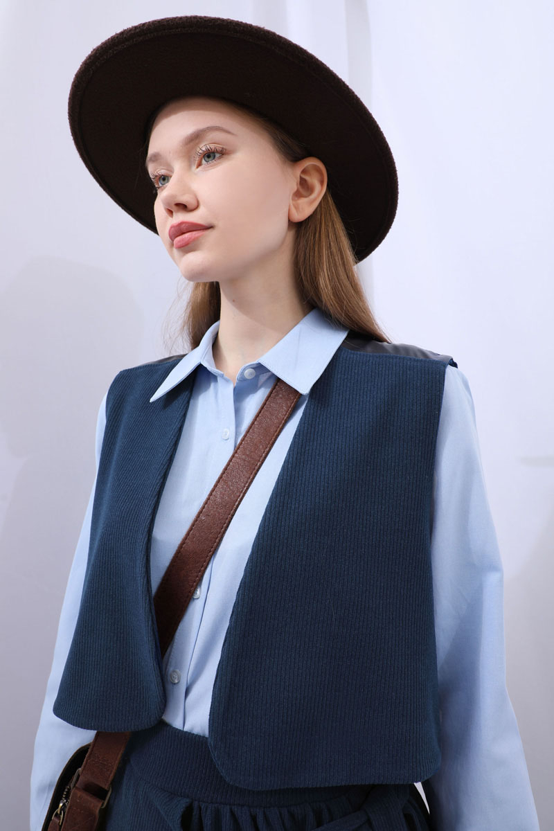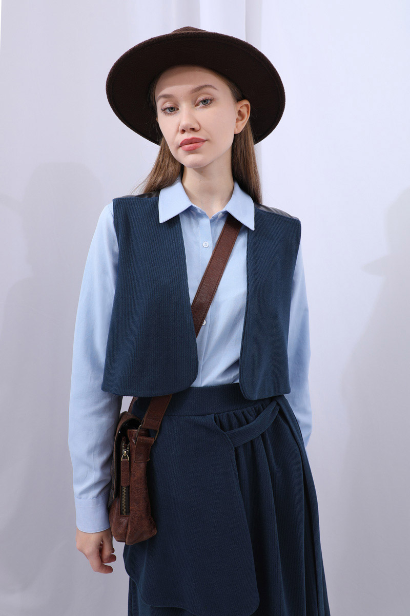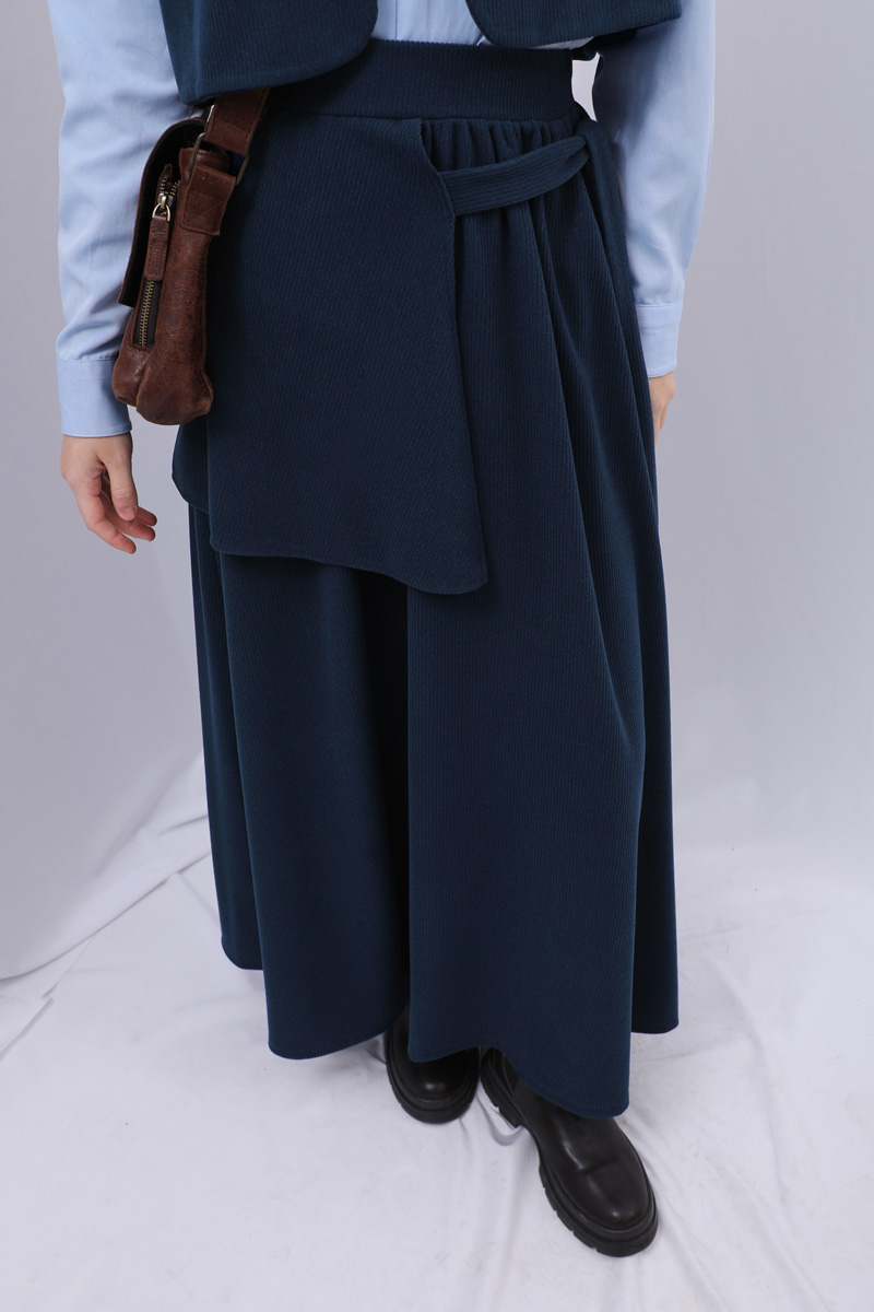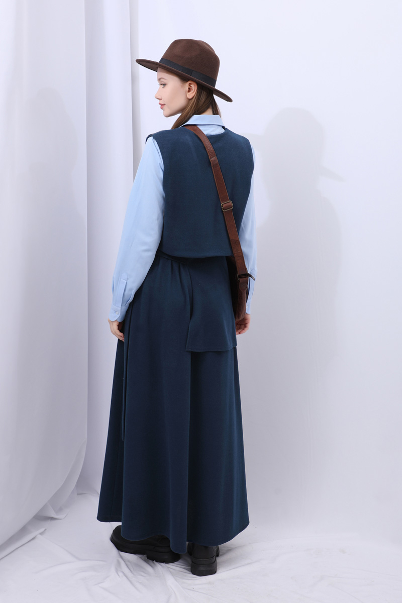 Yelekli Triko Takım Lacivert. Yelek omuzdan parça deri detaylıdır, etek yandan bağlamalı parça detaylıdır, yandan fermuarlıdır, cepsizdir, kloş kesimdir, astarsızdır, iç göstermez. Günlük kullanım ve özel günlerinizde tercih edebilirsiniz.