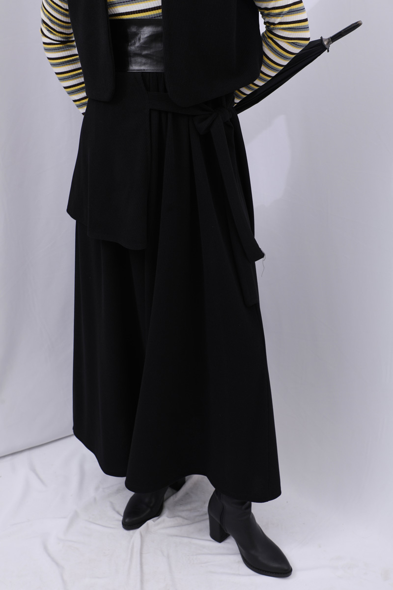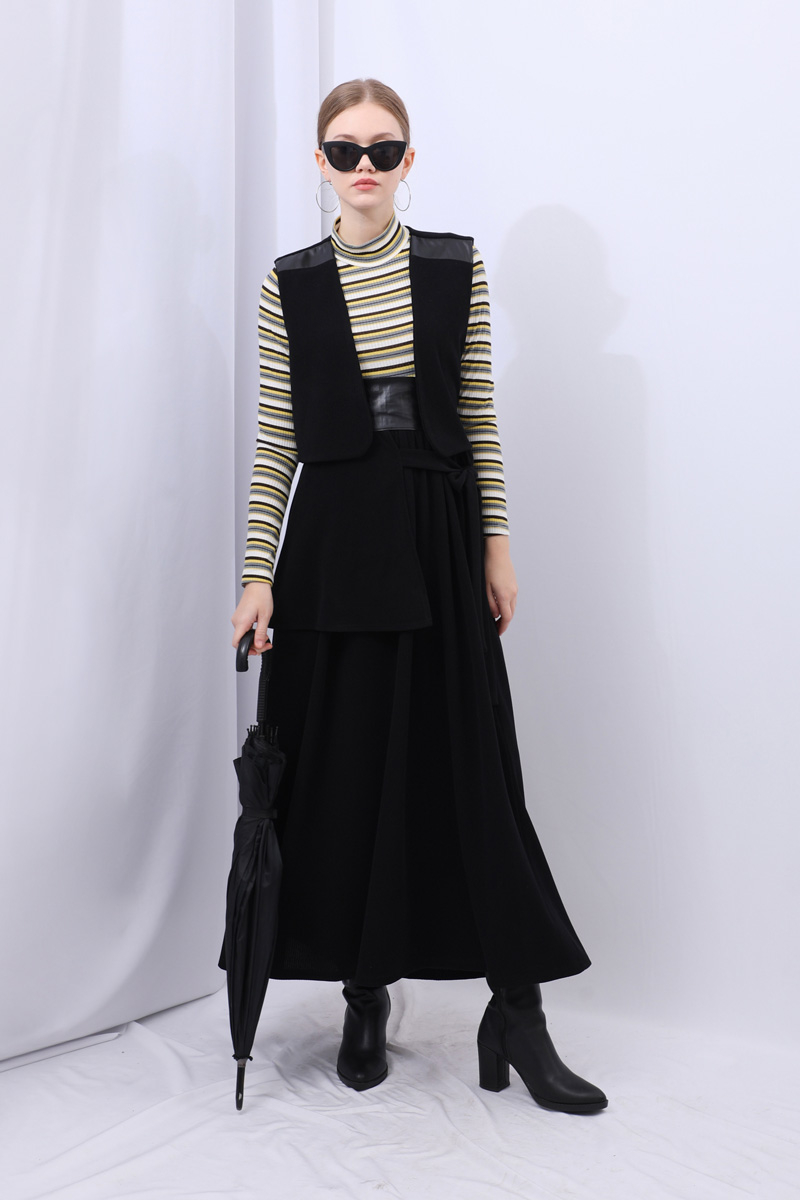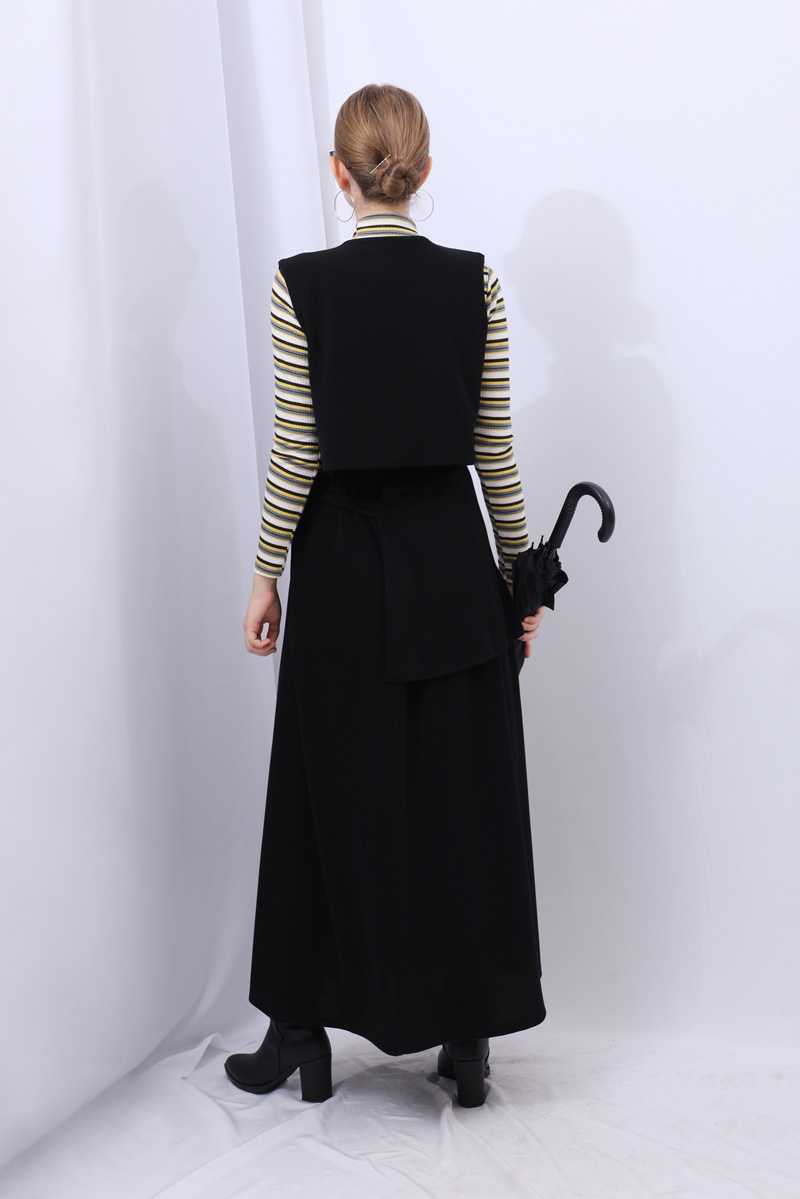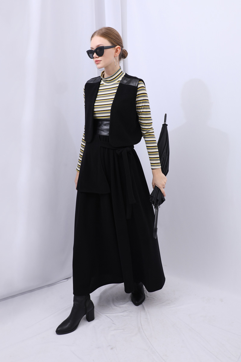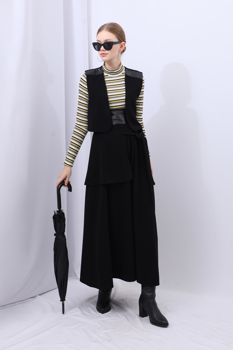 Yelekli Triko Takım Siyah. Yelek omuzdan parça deri detaylıdır, etek yandan bağlamalı parça detaylıdır, yandan fermuarlıdır, cepsizdir, kloş kesimdir, astarsızdır, iç göstermez. Günlük kullanım ve özel günlerinizde tercih edebilirsiniz.