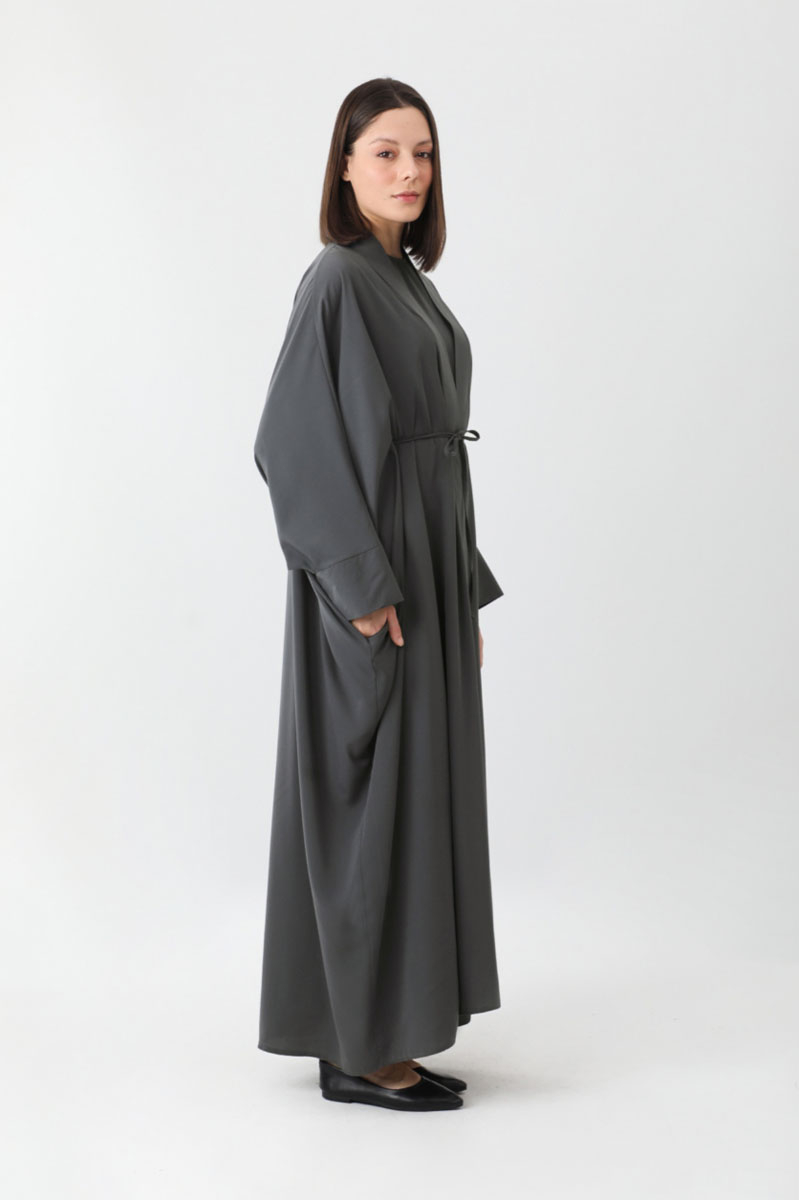 Yezra Abaya Füme. Abaya önde fleto ilik ve ince ip biyesi bulunmaktadır yarasa kolludur, yandan ceplidir, Geniş manşetlidir, astarsız. İçliği bisiklet yakadır, arkadan gizli fermuarlıdır. Günlük kullanım ve özel günlerinizde tercih edebilirsiniz.