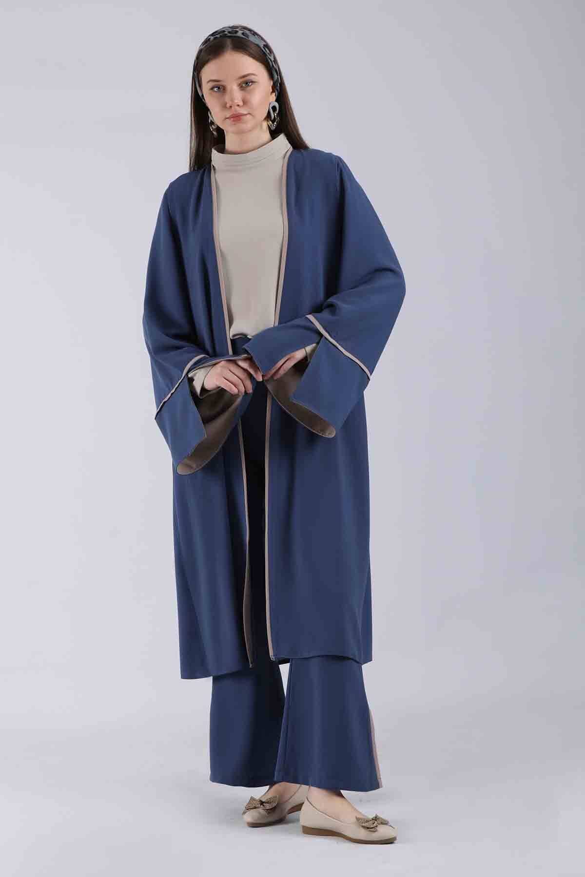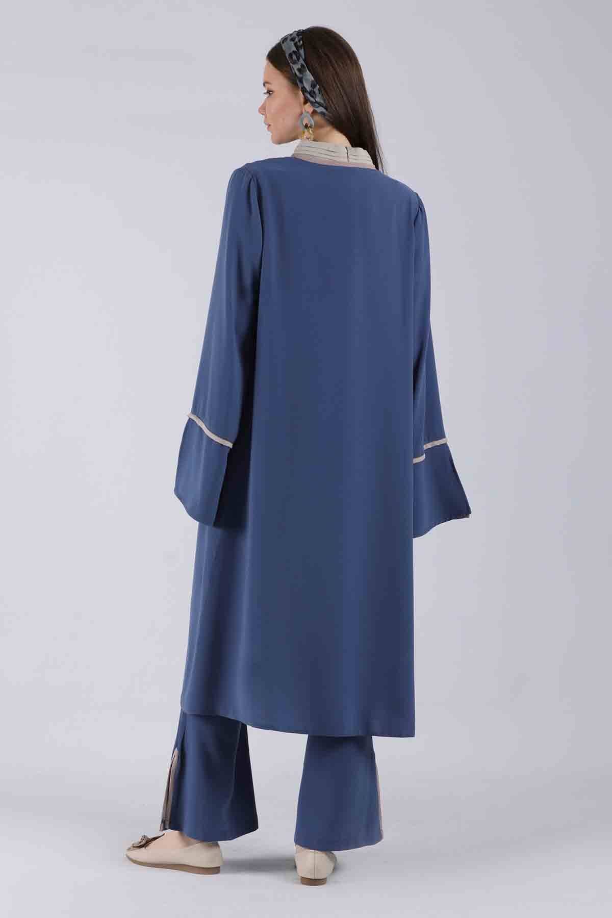 Yırtmaçlı Abaya Takım İndigo. Pantolon ve Abayadaki yırtmaç detayı ürünü bambaşka bir seviyeye taşımaktadır. Yeni sezonun favori ürünüdür.