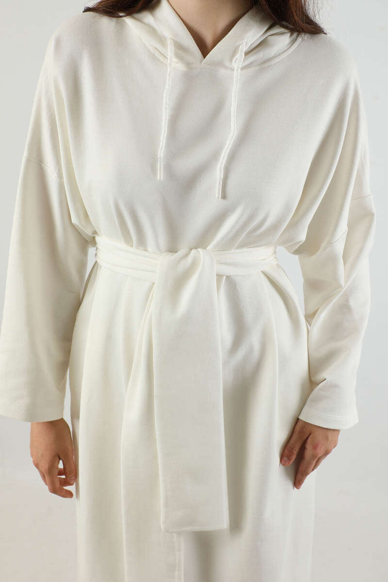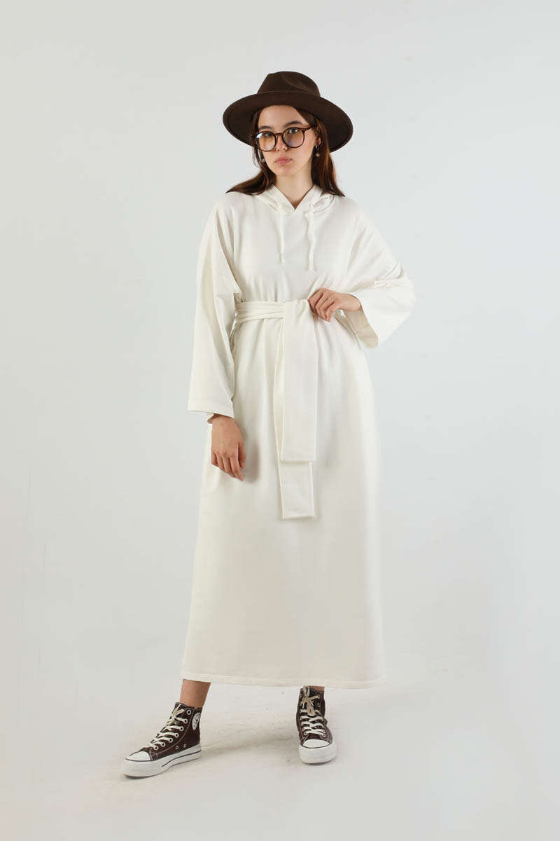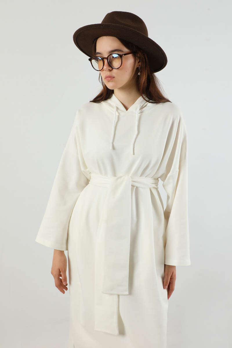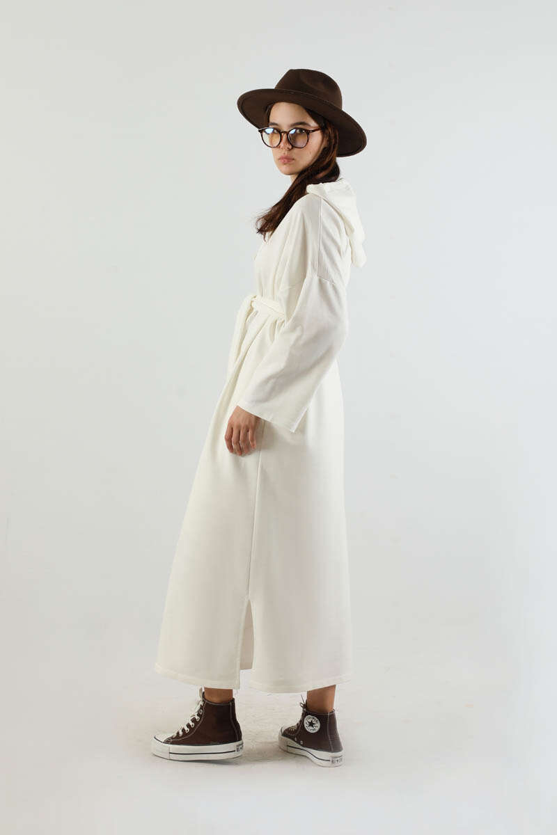 Yırtmaçlı Kapüşonlu Elbise Ekru. Düşük omuzludur. Kapüşonludur. Önden bağcık detaylıdır. Etek yırtmaçlıdır. Geniş kuşaklıdır. Günlük kullanım ve özel günlerinizde tercih edebilirsiniz.