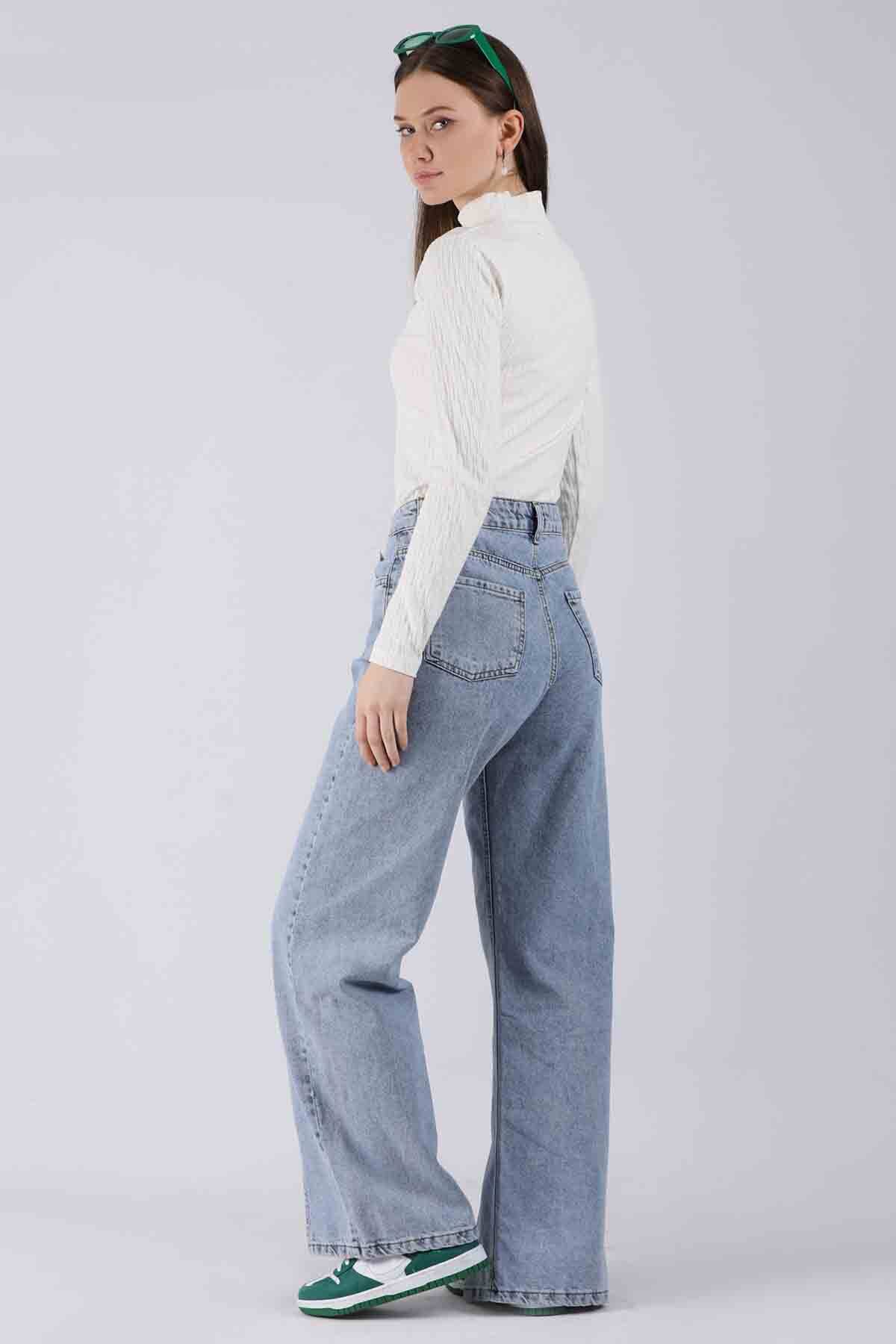 Yırtmaçlı Kot Pantolon Açık Mavi. Önden dikiş izli ve yırtmaçlıdır.