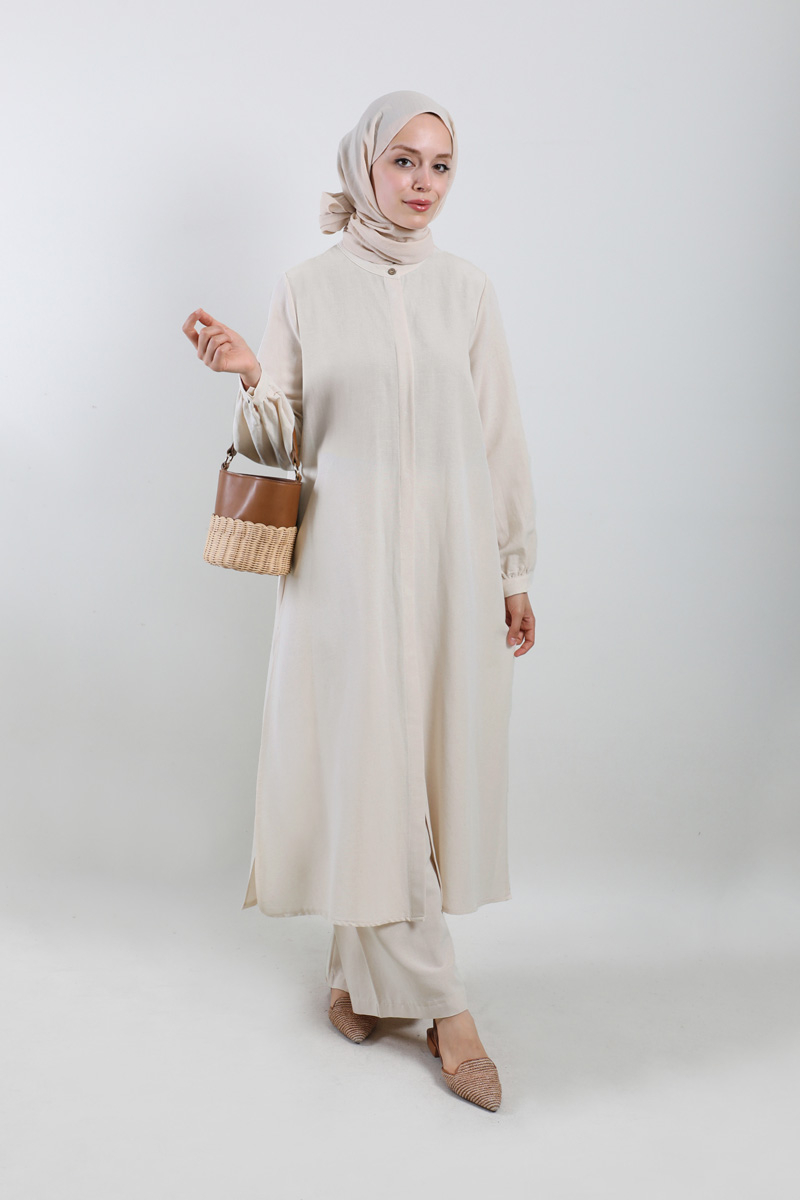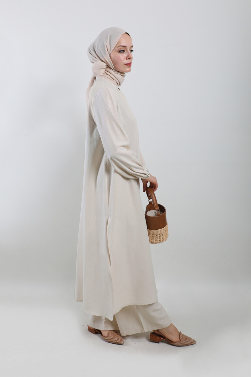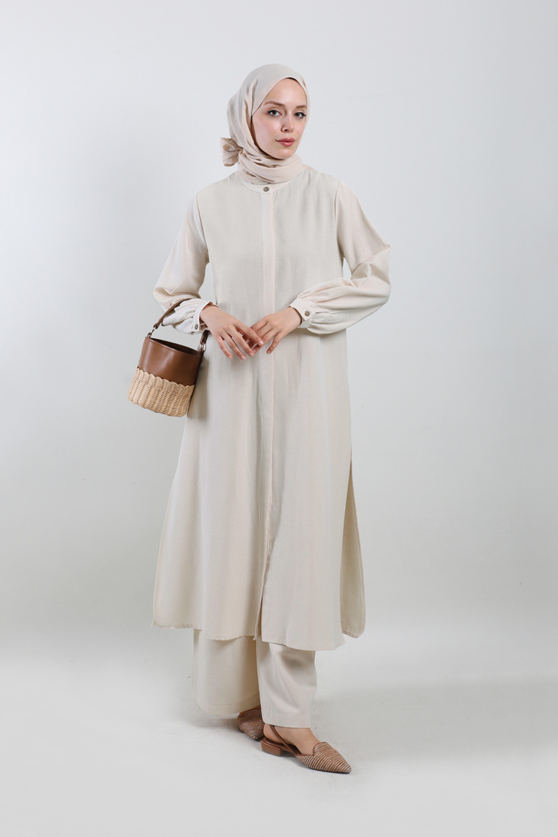 Yırtmaçlı Uzun Gömlek Takım Krem