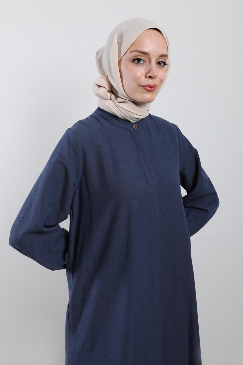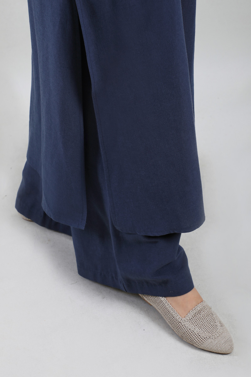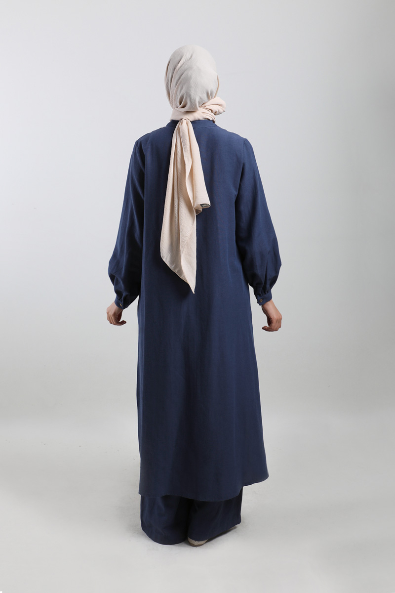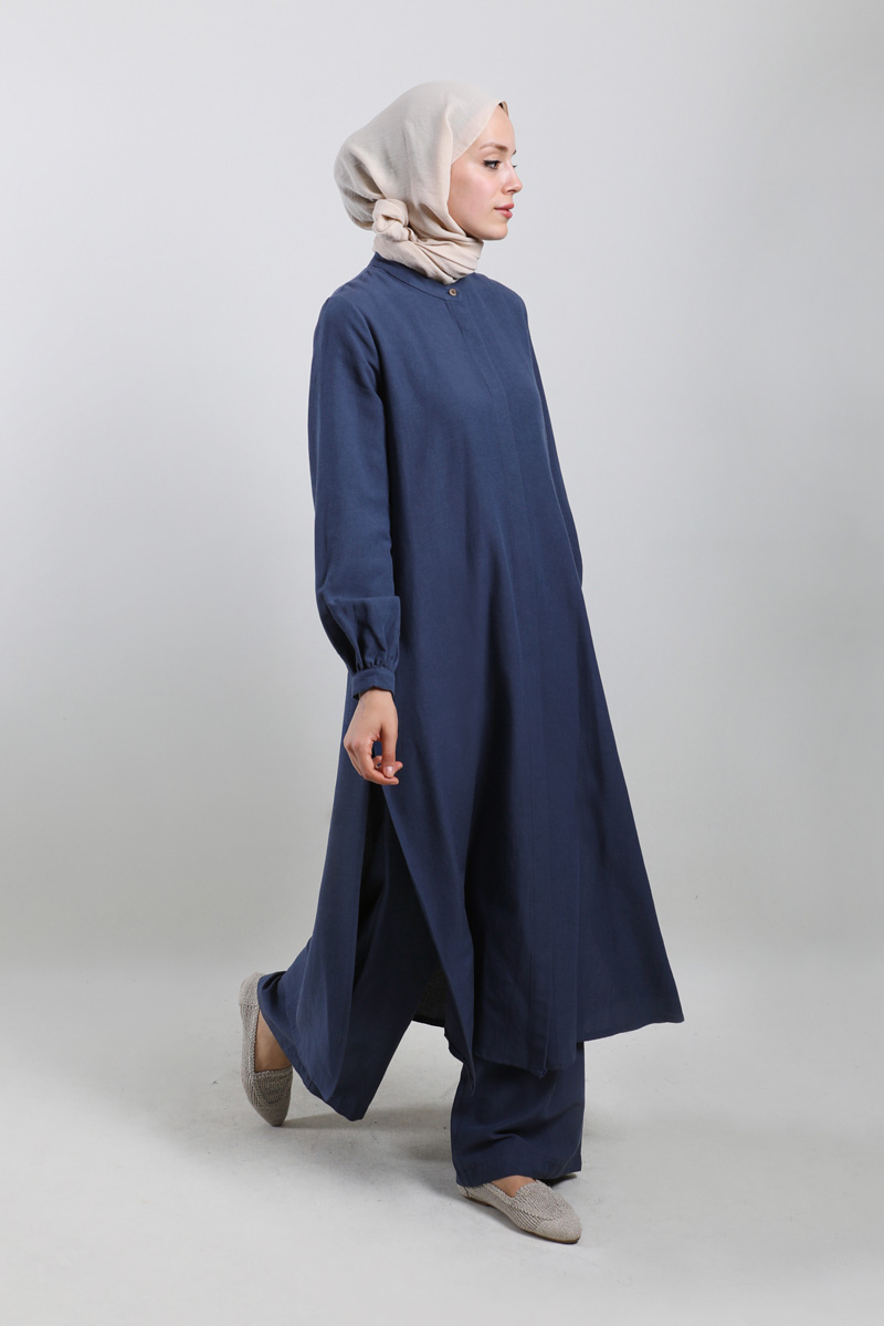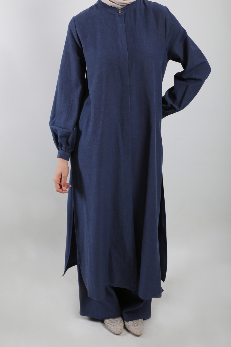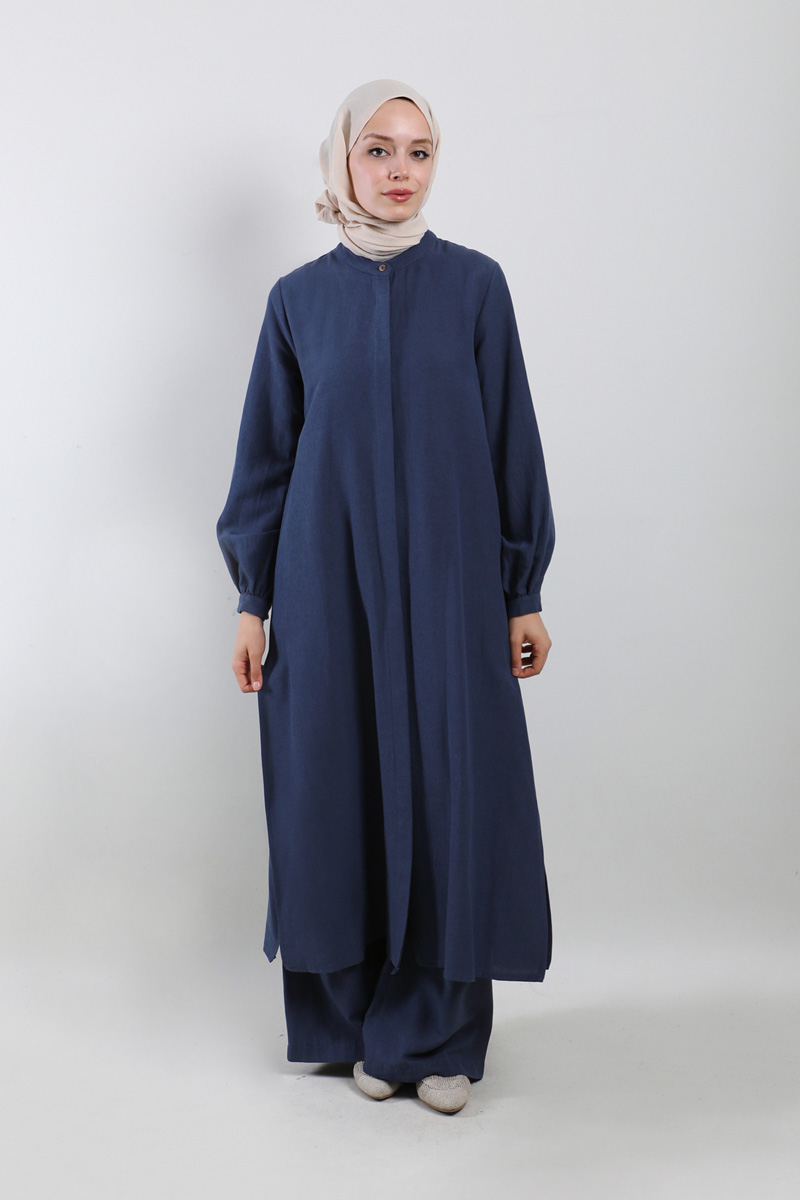 Yırtmaçlı Uzun Gömlek Takım Lacivert. Hakim yakalıdır, gizli düğmelidir, yandan yırtmaçlıdır, cepsizdir, pantolon beli önden düğmeli, fermuarlı ve arkadan lastiklidir, yandan ceplidir, önden pilelidir, geniş paçalıdır, astarsızdır.