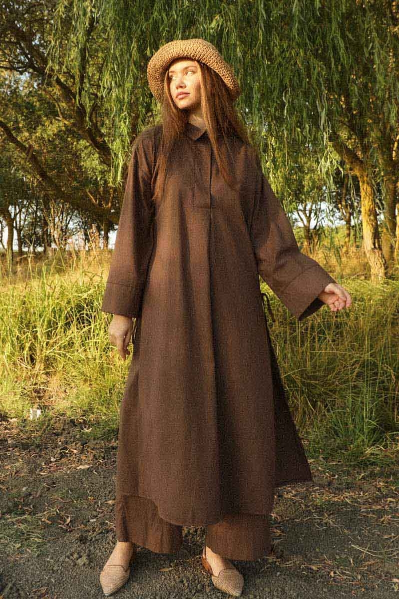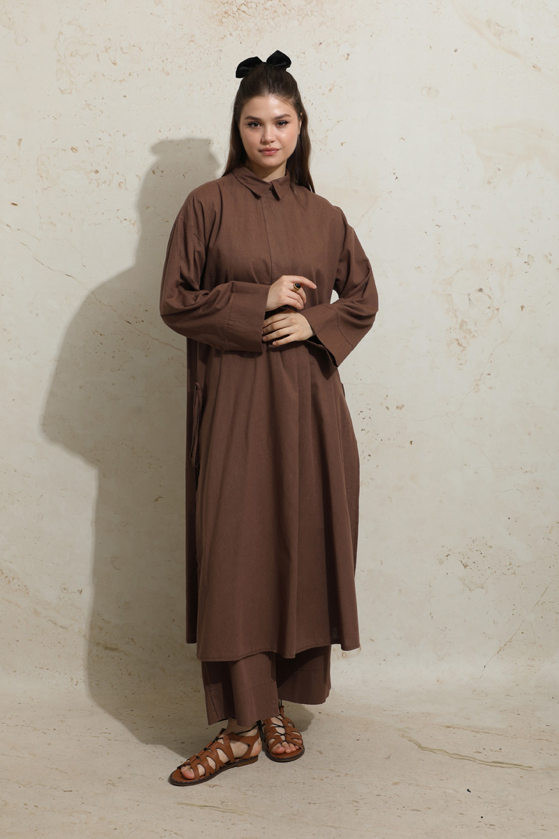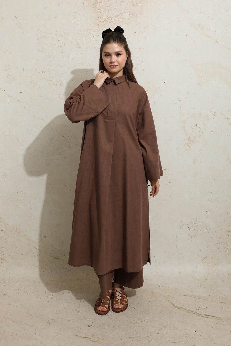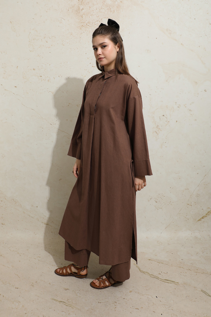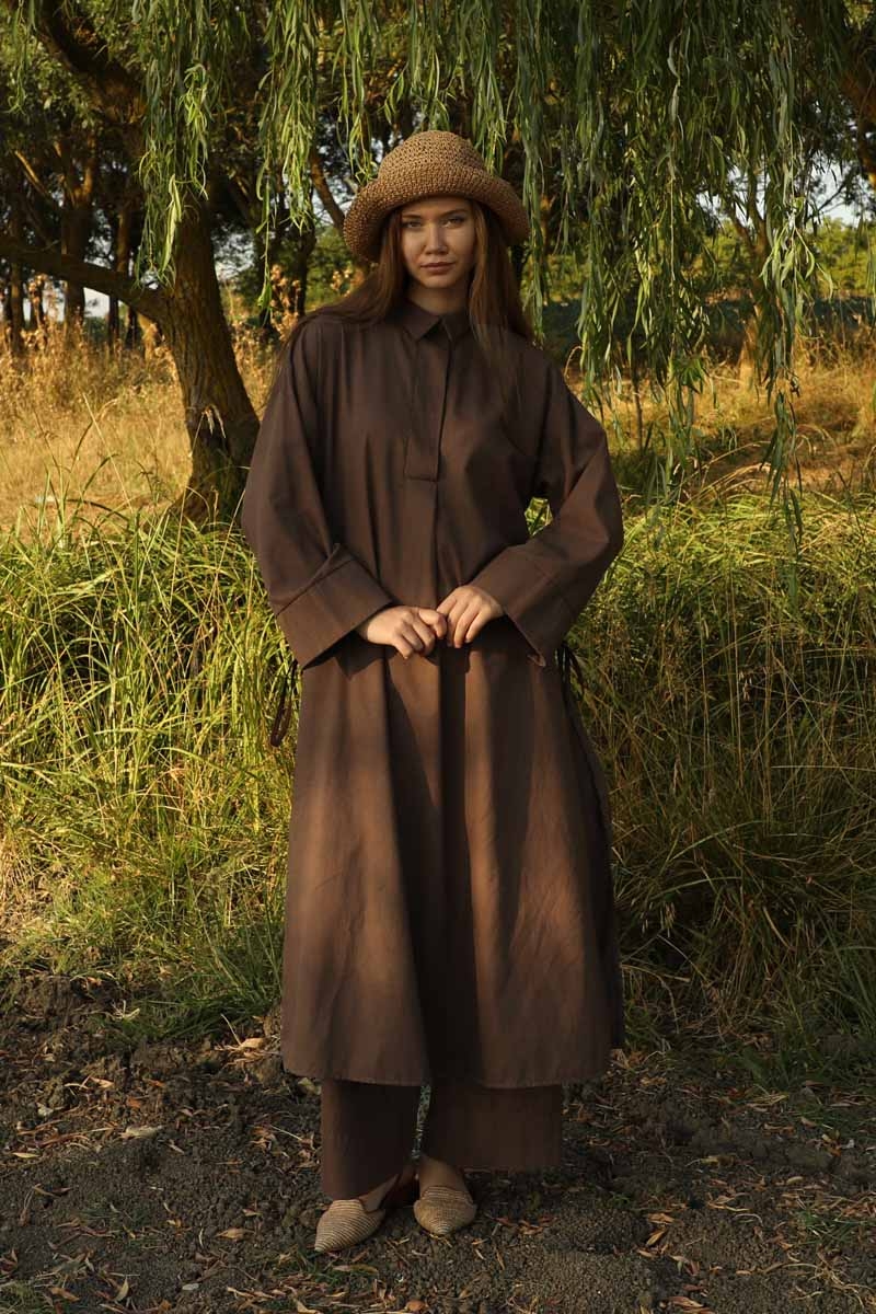 Yırtmaçlı Uzun Tunik Takım Kahverengi.Gömlek yakalıdır, yarım gizli düğmelidir, geniş kolludur, yan kısmında bağcık detayı mevcuttur, yandan bağcığa kadar yırtmaçlıdır, tunik cepsizdir. Pantolon arkadan lastiklidir, yandan fermuarlıdır, yandan ceplidir.