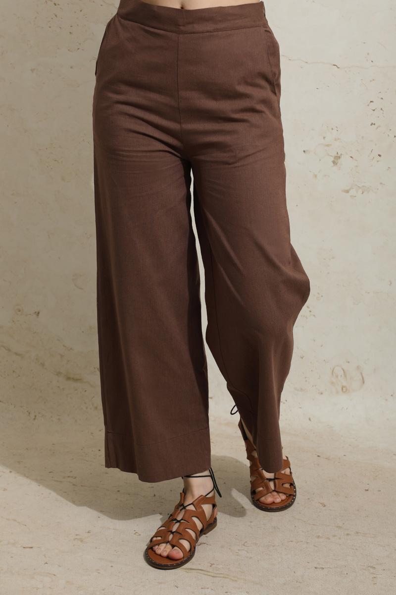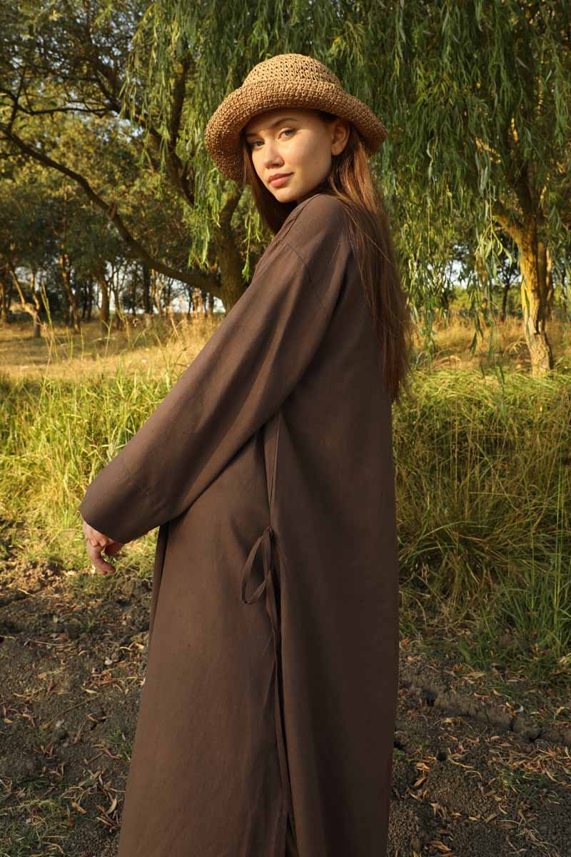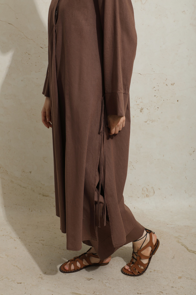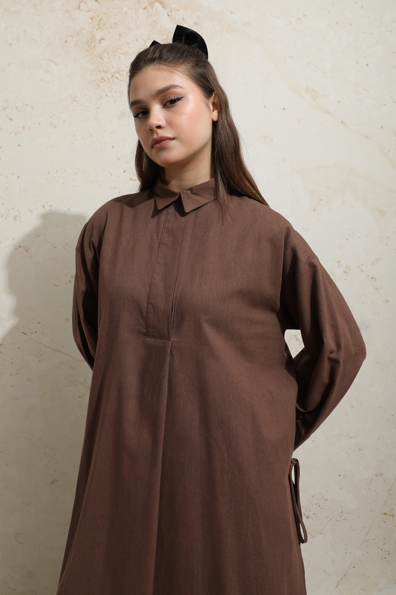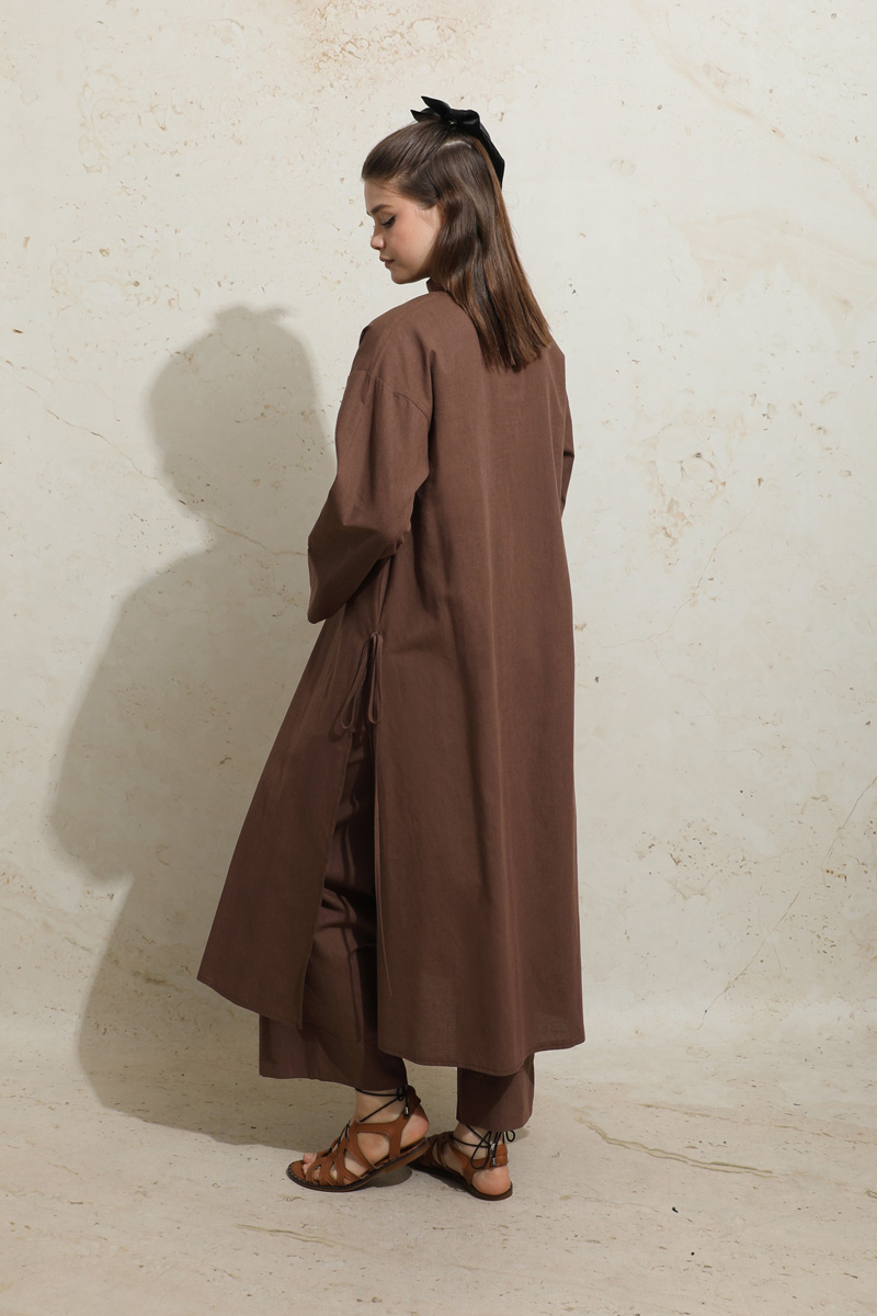 Yırtmaçlı Uzun Tunik Takım Kahverengi.Gömlek yakalıdır, yarım gizli düğmelidir, geniş kolludur, yan kısmında bağcık detayı mevcuttur, yandan bağcığa kadar yırtmaçlıdır, tunik cepsizdir. Pantolon arkadan lastiklidir, yandan fermuarlıdır, yandan ceplidir.