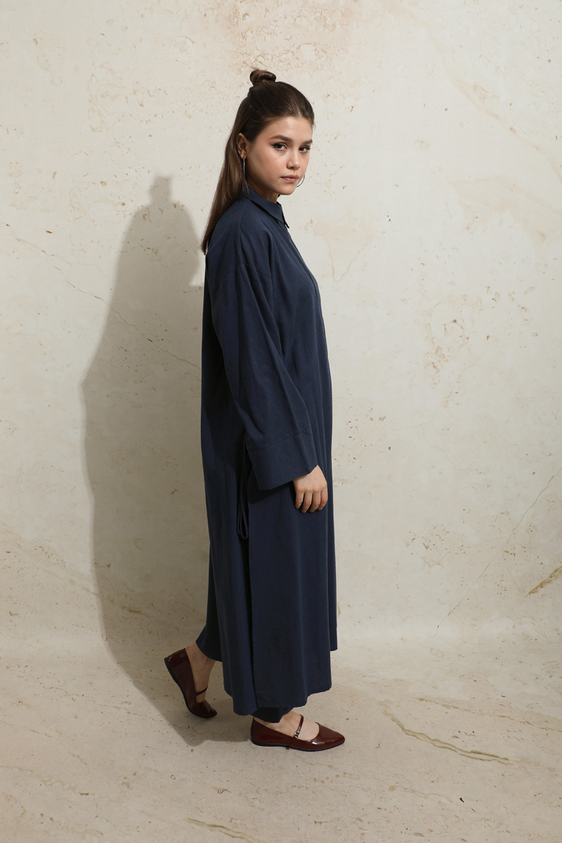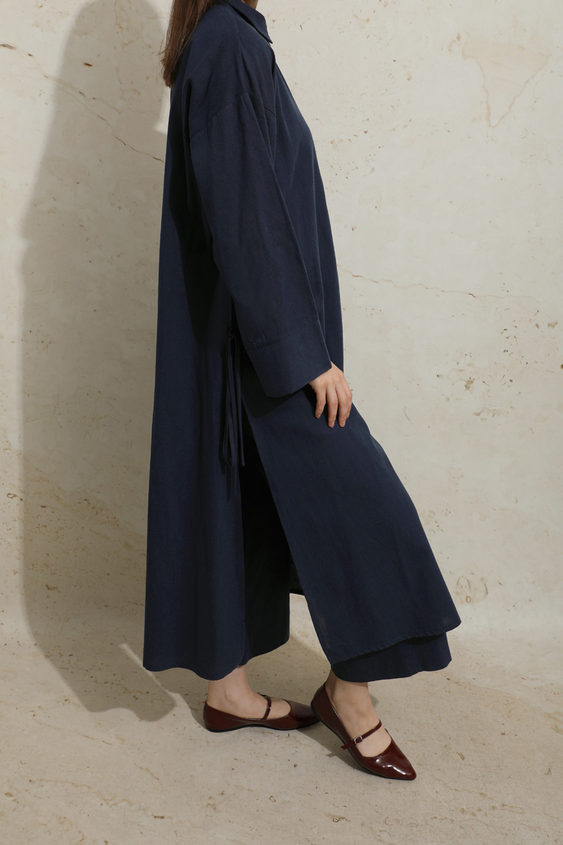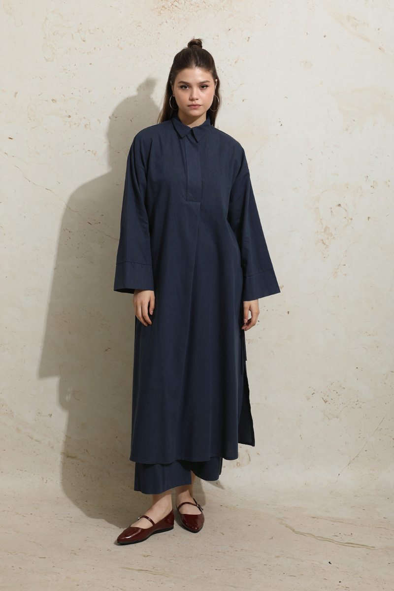 Yırtmaçlı Uzun Tunik Takım Lacivert.Gömlek yakalıdır, yarım gizli düğmelidir, geniş kolludur, yan kısmında bağcık detayı mevcuttur, yandan bağcığa kadar yırtmaçlıdır, tunik cepsizdir. Pantolon arkadan lastiklidir, yandan fermuarlıdır, yandan ceplidir.