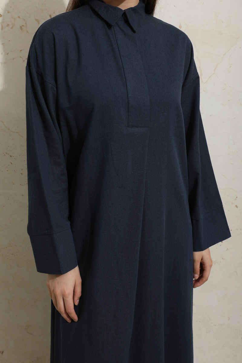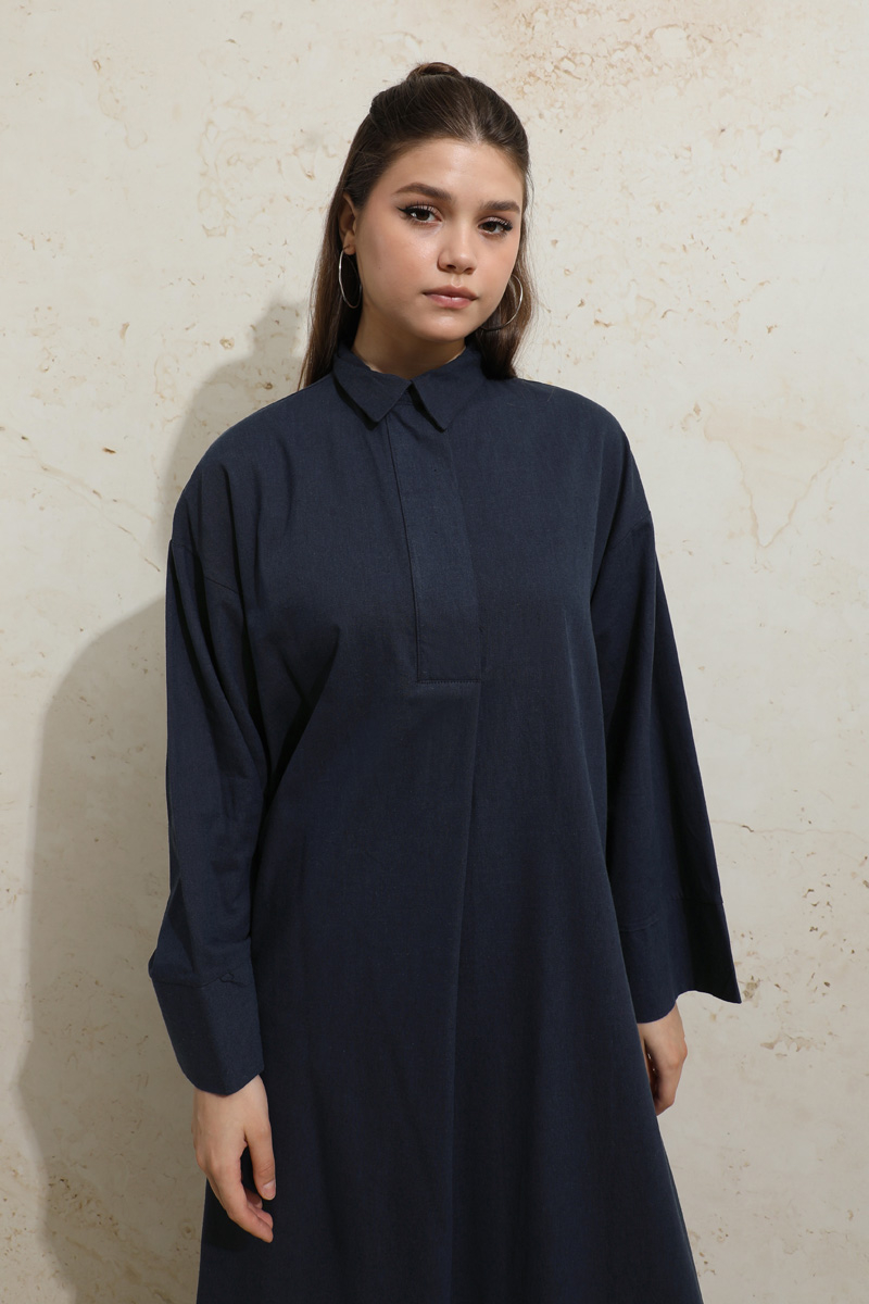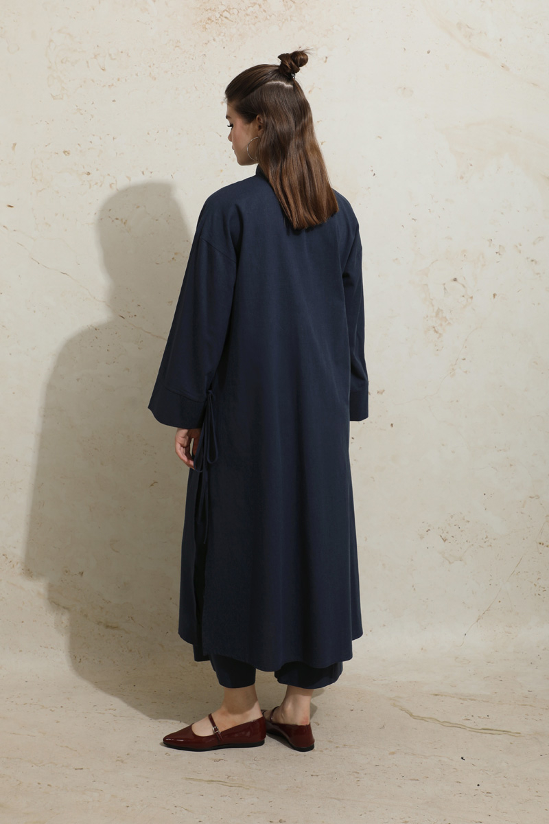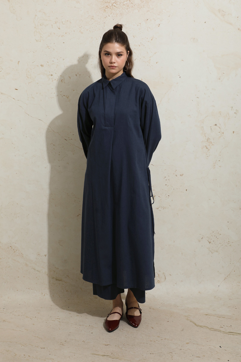 Yırtmaçlı Uzun Tunik Takım Lacivert.Gömlek yakalıdır, yarım gizli düğmelidir, geniş kolludur, yan kısmında bağcık detayı mevcuttur, yandan bağcığa kadar yırtmaçlıdır, tunik cepsizdir. Pantolon arkadan lastiklidir, yandan fermuarlıdır, yandan ceplidir.
