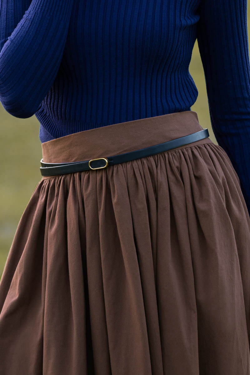 Yüksek Bel Pamuk Etek Kahverengi, doğal dokusu ve konforlu kesimiyle günlük kombinlerinize zarif bir dokunuş katar. Yüksek bel formu ve büzgülü tasarımı sayesinde feminen bir siluet oluştururken, uzun boyu ile hem klasik hem de modern kombinlerde kullanılabilir.