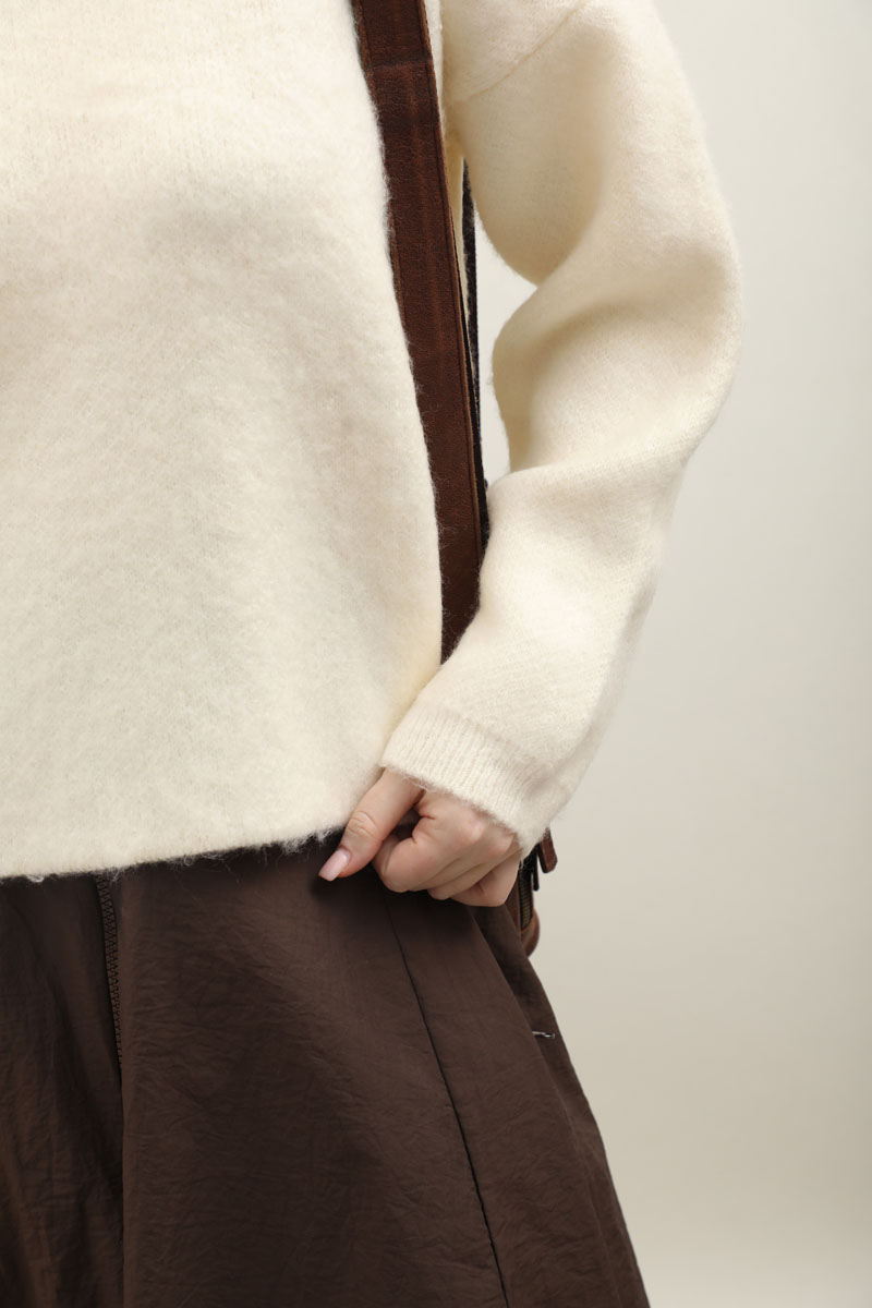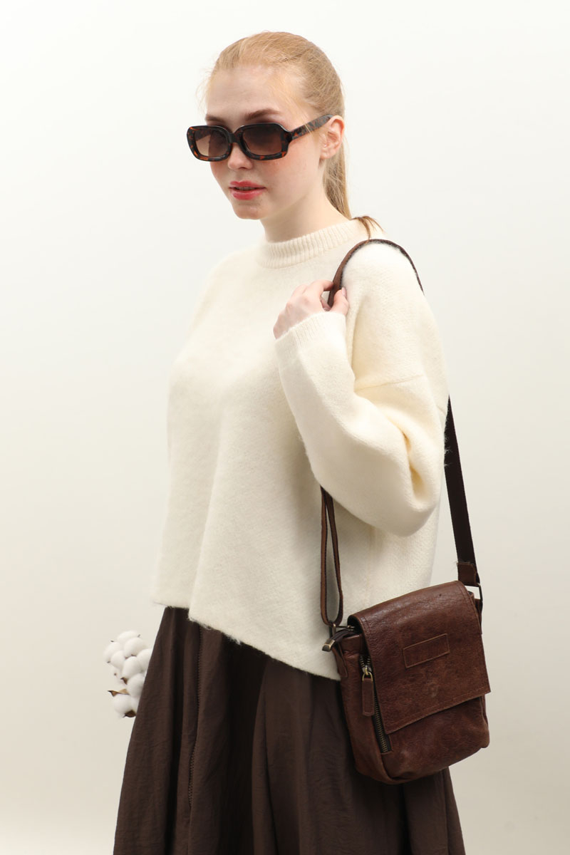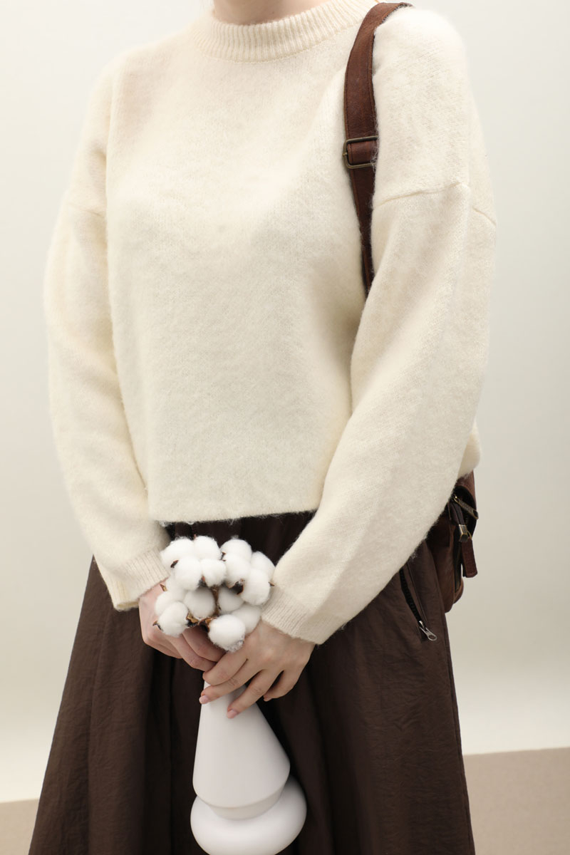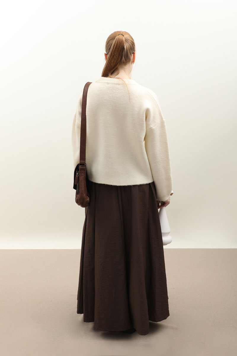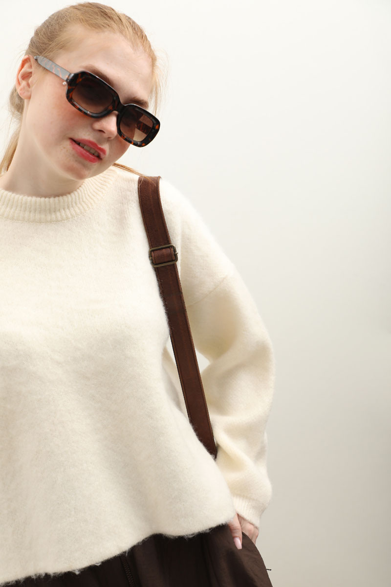 Yünlü Kısa Kazak Ekru. Bisiklet yaka, düşük omuzlu, manşeti ve yakası ribanadır. Etek, elbise ve pantolon üzerine tercih edilebilir. Kış aylarında tercih edebilirsiniz.