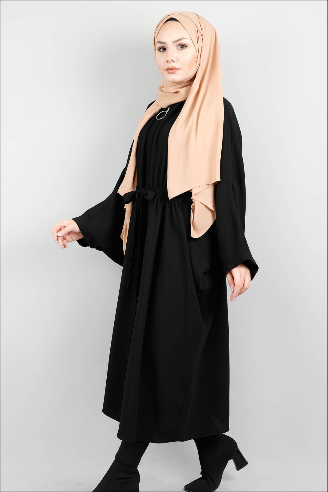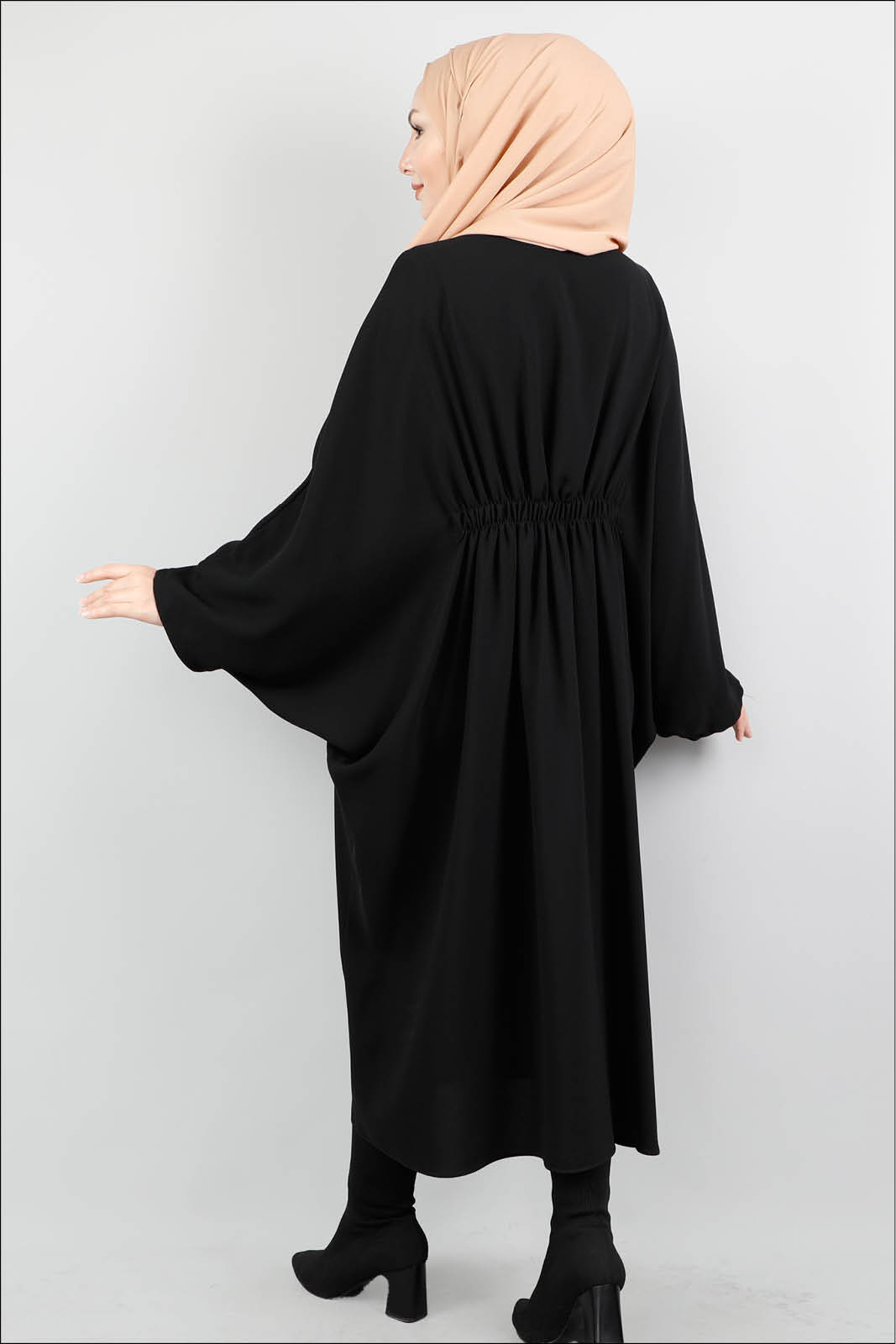 The bat is the arm. It has a front zipper. Can be tied with waist belt.