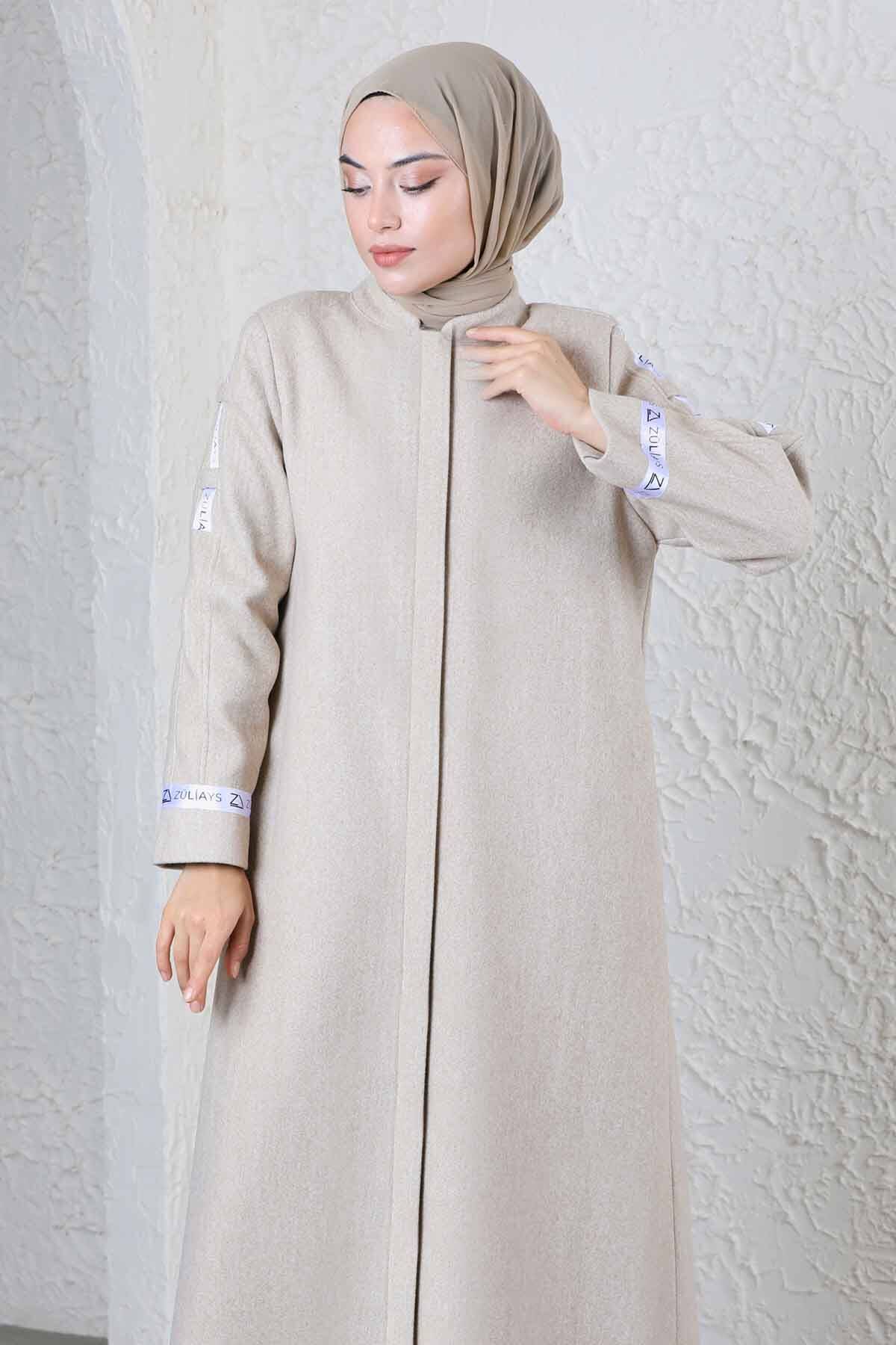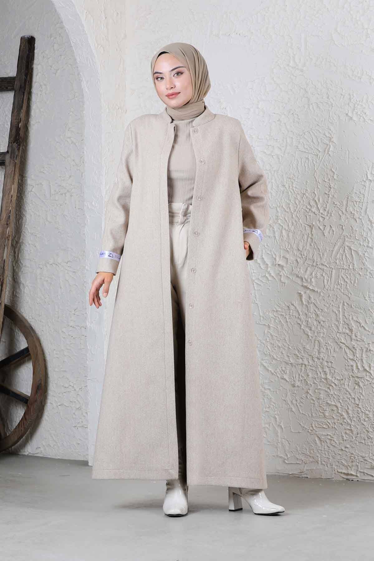 Zülays Striped Long Stamp Coat Stone. Tippet. It is lined. It has two side pockets. It has a hidden button.